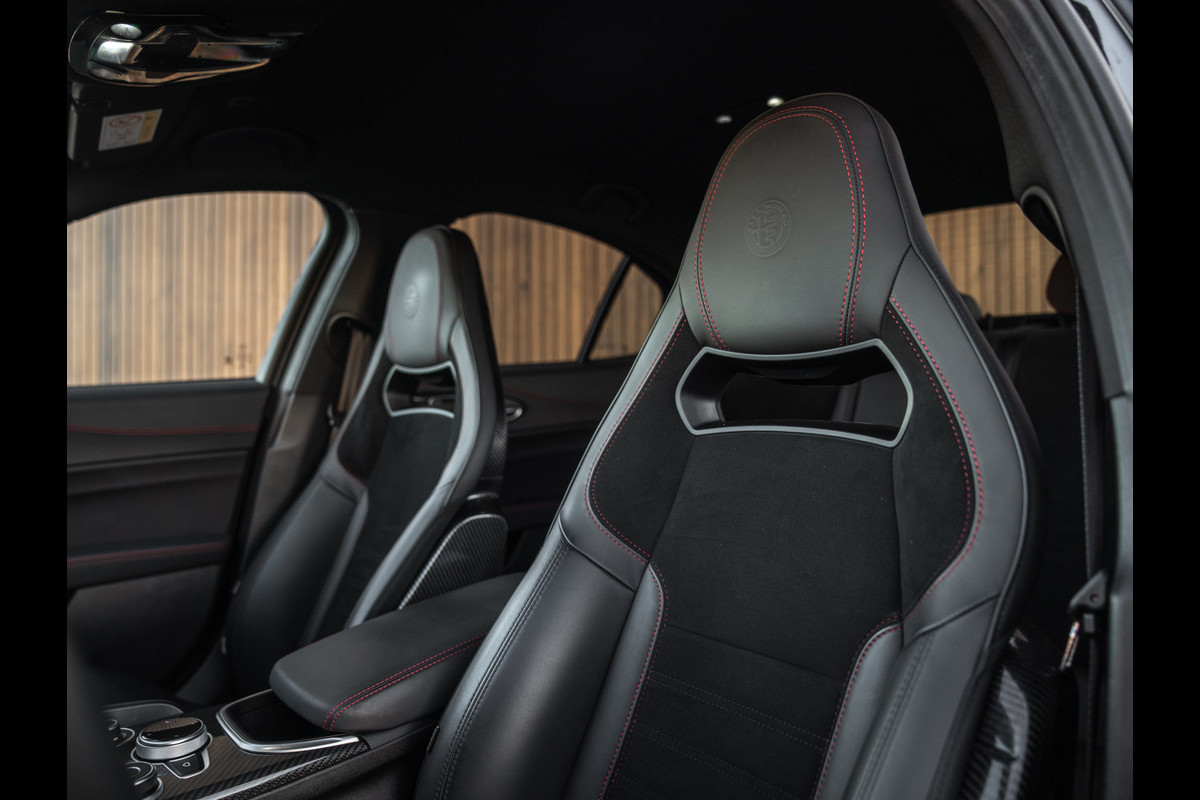 Toegegeven, de Rosso Competizione lak staat deze anabolen Alfa waanzinnig. Echter, zó is de Giulia Quadrifoglio op haar puurst: inktzwart van boven tot onder. Letterlijk. Diverse Carbon details – waaronder de frontlip, sideskirts, diffuser en kofferklepspoiler – gaan voor het oog op in de duistere, Nero Vulcano carrosserie van onze performance-gedreven Berlina. De mysterie is compleet dankzij de 19 inch spaak-wielen. Erachter pronken Rosso remklauwen die het race-DNA weerspiegelen van de Romeo onder de Giulia’s. Bredere spatborden, dikkere bumpers, extra koelsleuven en een enorme diffusor zijn typerend voor elke moderne Q-versie. Zo ook deze. De 2 dubbele eindstukken van het Akrapovič sportuitlaatsysteem onderstrepen het heftige karakter van de Alfa. Het is dat er 4 portieren in de sportsedan zitten, anders zouden we toch zweren een supercar pur sang tegenover ons te hebben. En we verklappen alvast: de looks corresponderen met de prestaties…