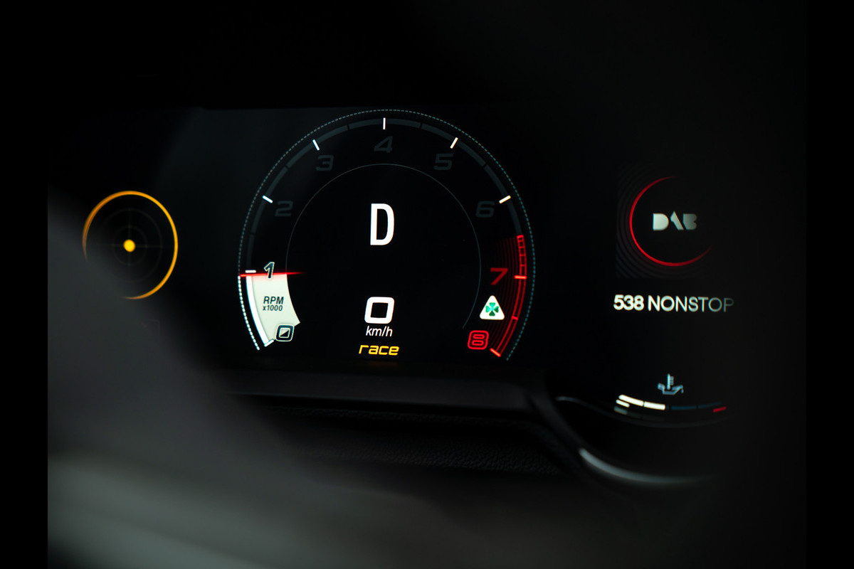 Binnen volgt het ene na het andere carbon hoogtepunt zich in een recordtempo op: midden-/tunnelconsole + dashboard finish laten zien uit welk racehout de in basis ‘keurige’ 4-deurs Berlina is gesneden. Alfa koos er bij deze generatie Giulia Q voor om ook de ultieme Veloce zetels te leveren, elektrisch verstelbaar, verwarmbaar en met memory! De Nero bekleding treft u tevens op het dashboard + het afgevlakte sportstuur – inclusief carbon insert. Klassieke cijfers in digitale vorm nemen u mee terug naar vervlogen tijden. Tijden waarin digibeten nog niet bestonden en instrumentenpanelen analoog waren. Zó’n gevoel hoort de échte sportauto een liefhebber te geven!