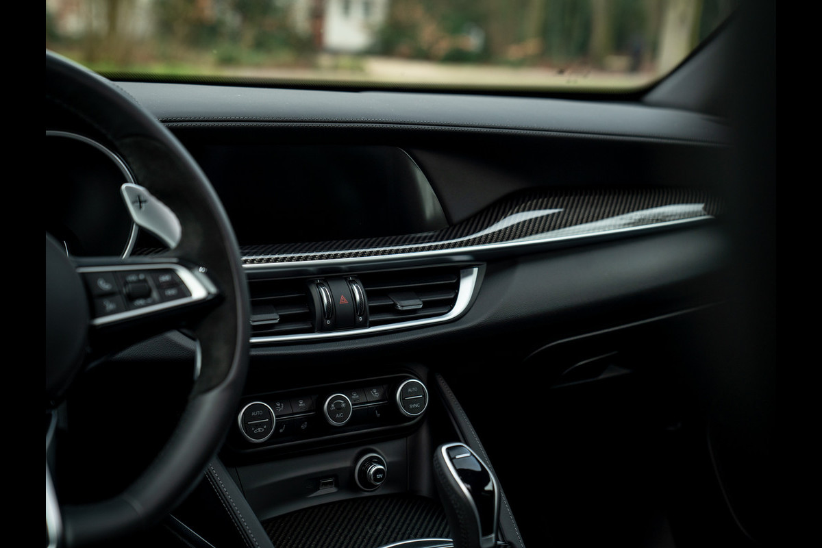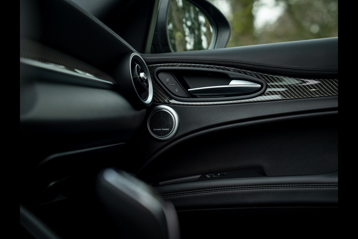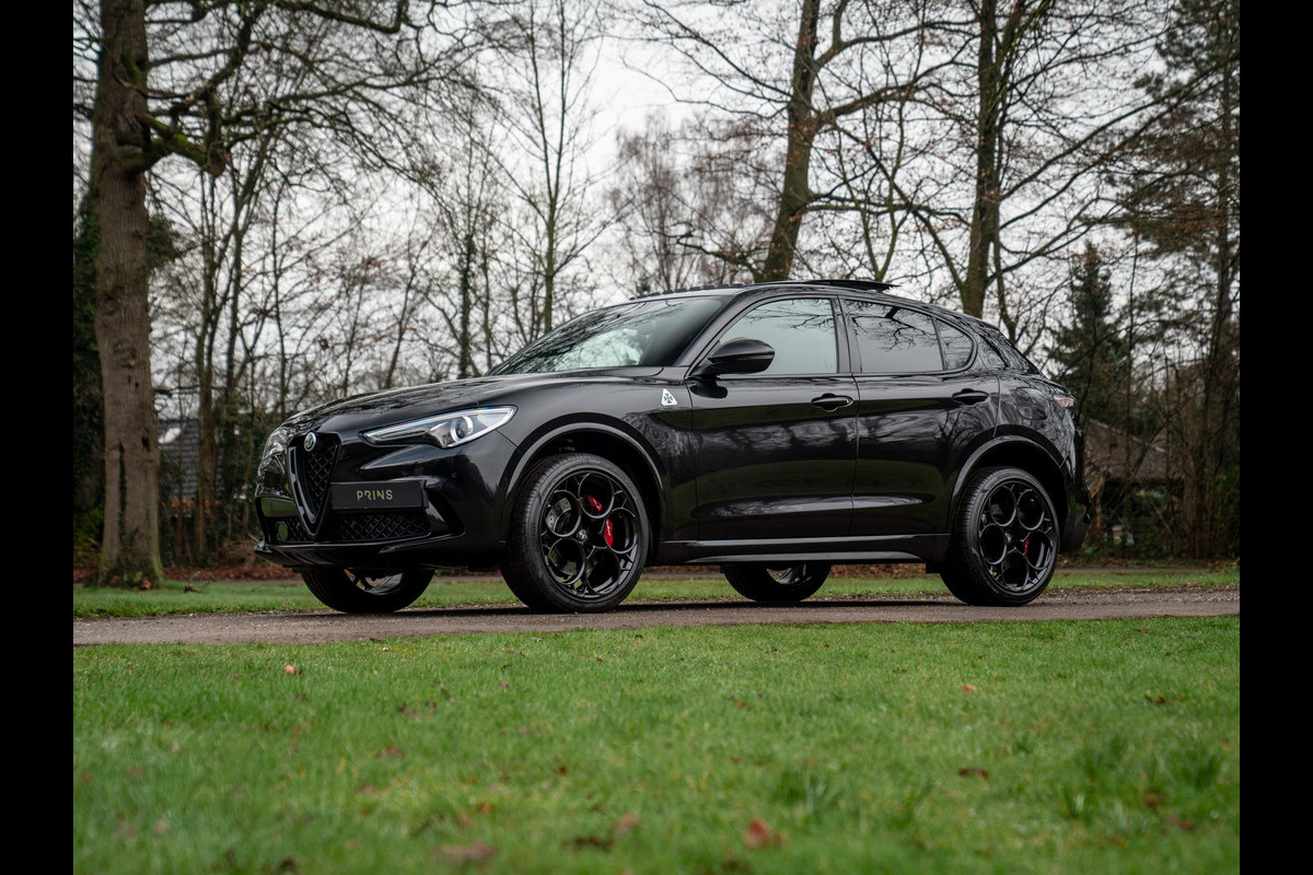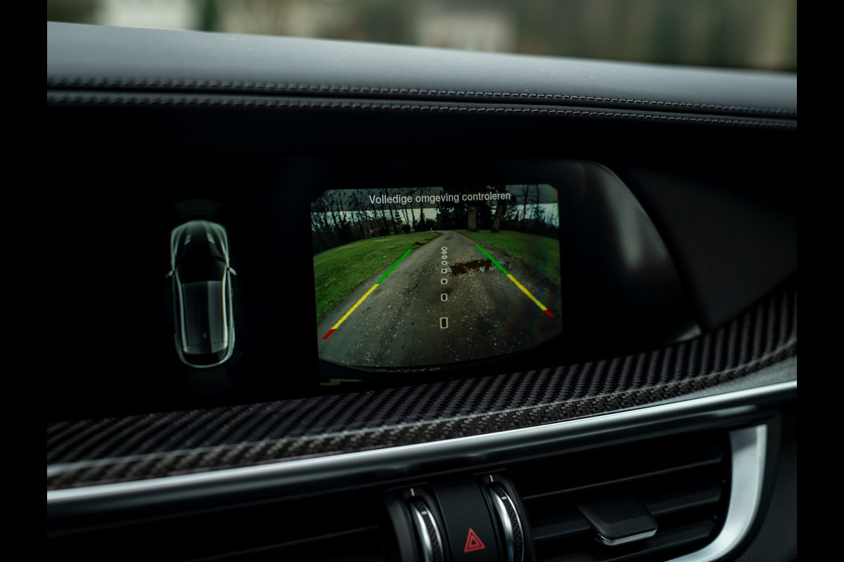 Heerlijke Stelvio Quadrifoglio in het Nero Vulcano met een Nero interieur, carbon interieurpakket, Harman/Kardon, panoramadak, Driver Assistance Pack 2 etc.