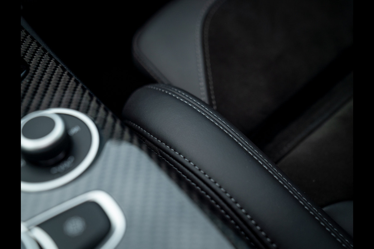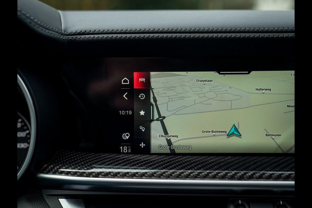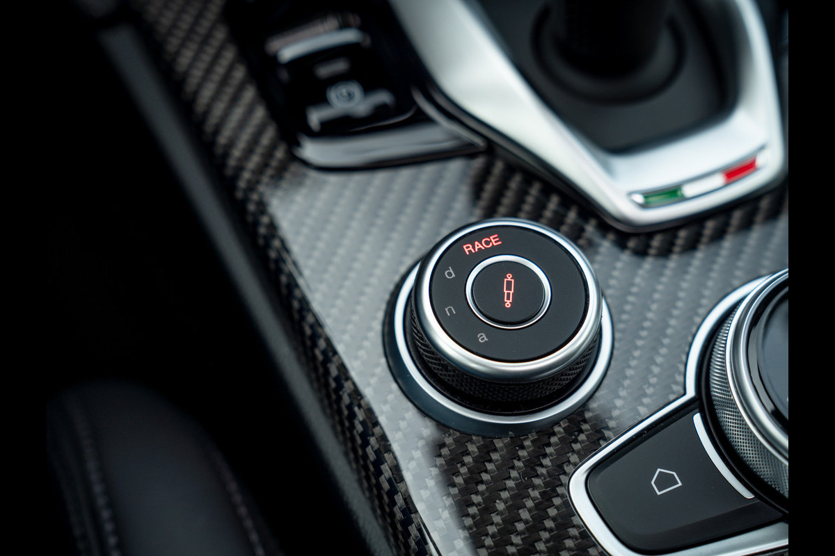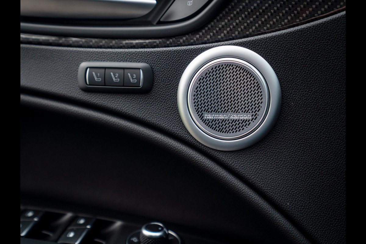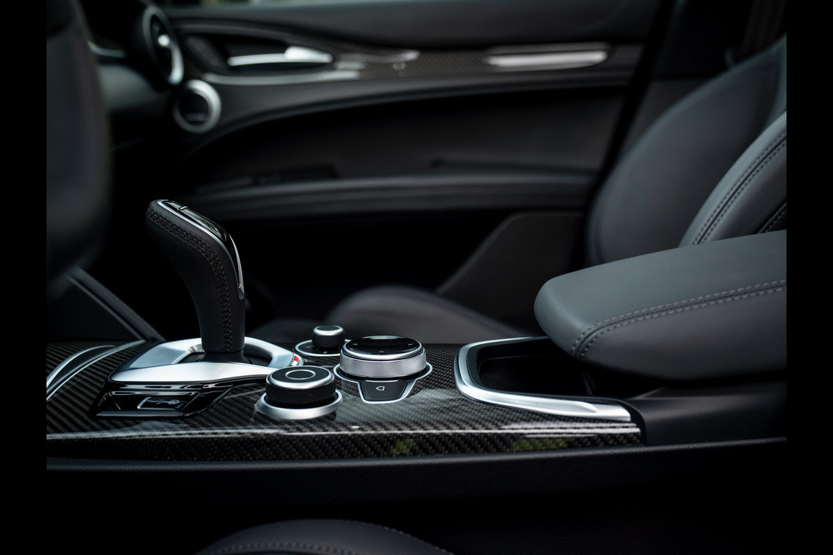 Heerlijke Stelvio Quadrifoglio in het Nero Vulcano met een Nero interieur, carbon interieurpakket, Harman/Kardon, panoramadak, Driver Assistance Pack 2 etc.