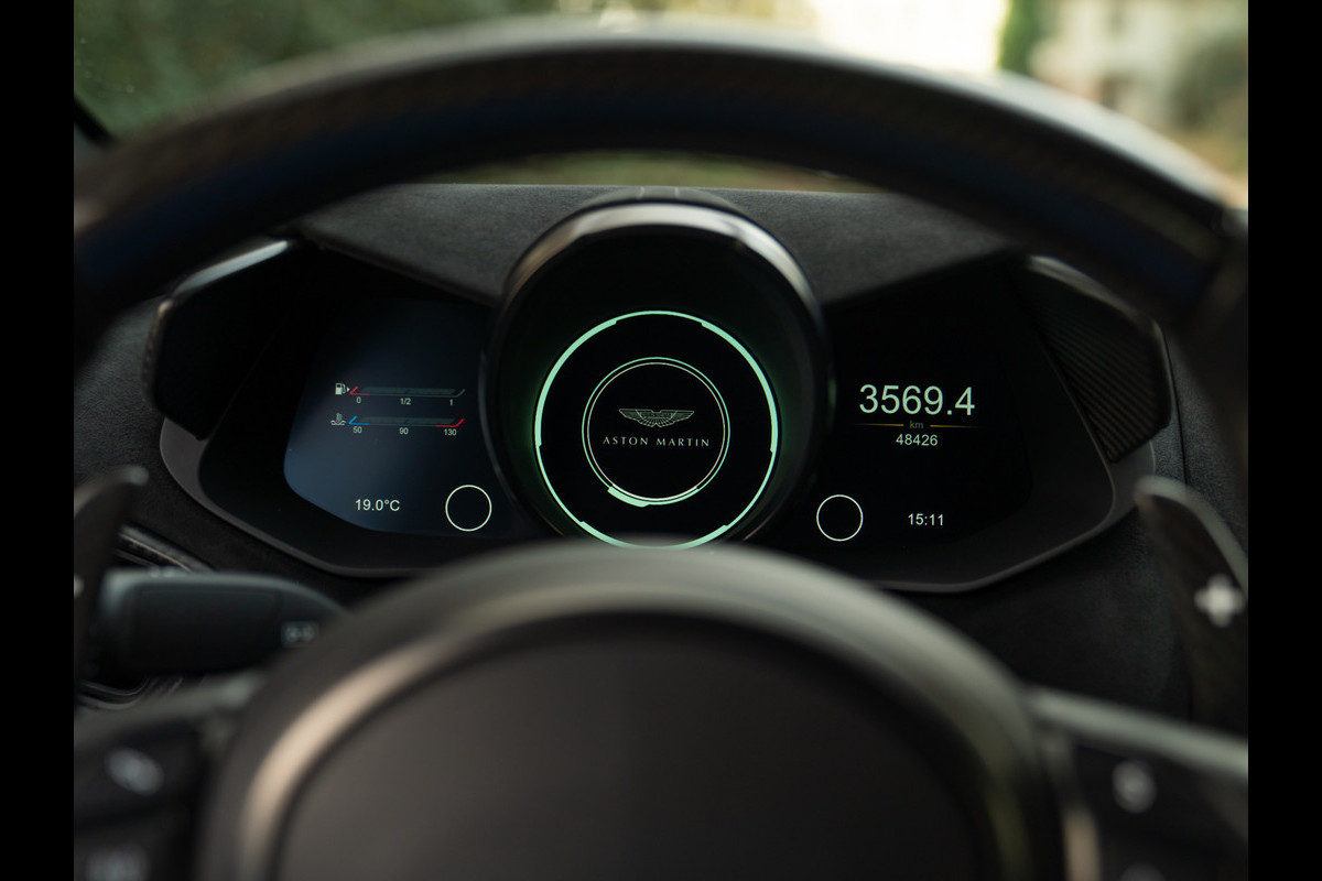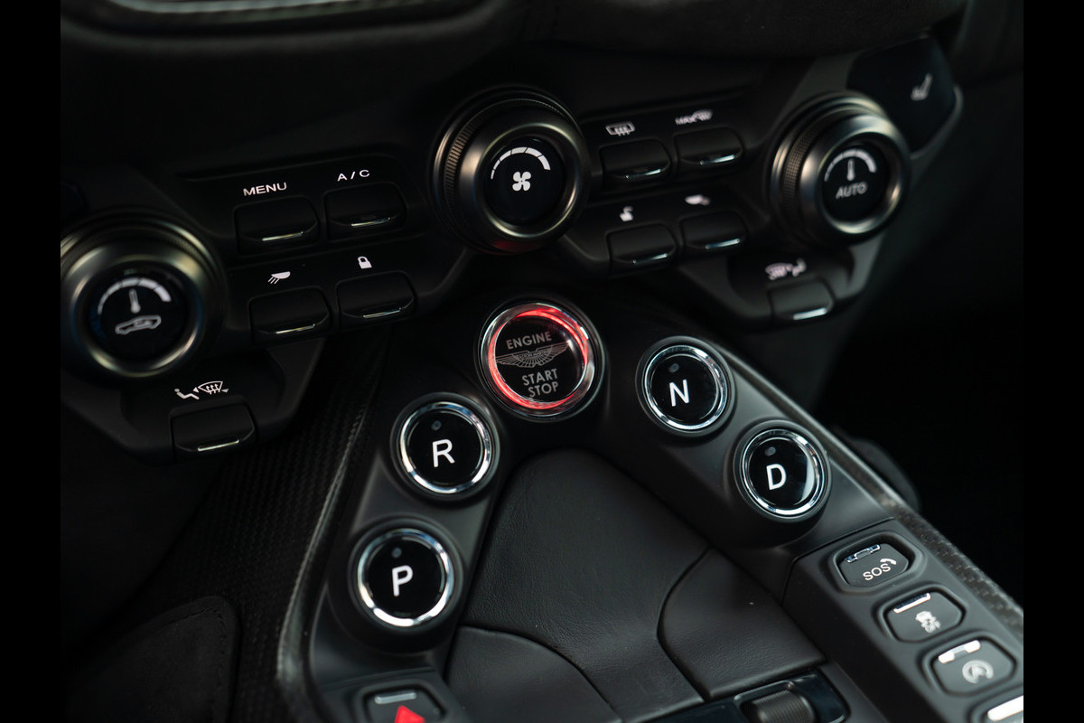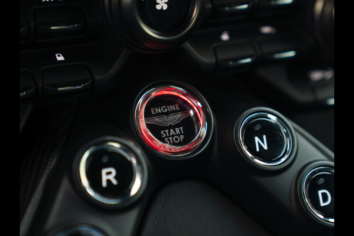 De cockpit is duister en knus, maar o zo spannend. Het is de afwisseling tussen Pure Black Alcantara en Obsidian Black leder waardoor het Aston Martin Vantage interieur allesbehalve ‘standaard’ oogt. Overtreffende trap is echter de rest van de aankleding: een Q Carbon Fibre Sports Plus Pack gecombineerd met een half lederen, half carbon afgevlakt sportstuur transformeert het Vantage binnenwerk in een heuse werkplek voor de geoefende bestuurders onder ons. Glass switches leggen het accent subtiel op de luxe kant van deze topsporter, maar worden overruled door een Dark Chome / Satin Carbon Interior Pack. Over de Alcantara Sport Plus stoelen treft u zwart lederen middenbanen en gestikte logo’s in de rugleuningen – mocht u tijdens het instappen nog twijfelen van welk merk deze briljante creatie is…