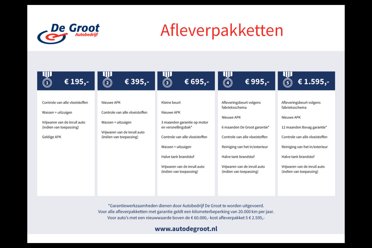 Kijk op www.autodegroot.nl of bel 0318-529652 voor meer informatie over onze afleverpakketten.