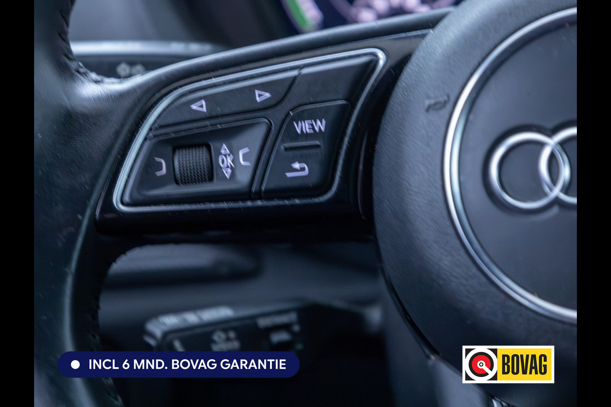 Dankzij het digitale dashboard leest u alle benodigde info gemakkelijk en overzichtelijk af. Met adaptive cruise control houdt deze auto automatisch afstand tot uw voorligger. U bedient het MMI navigatiesysteem en het Audi audiosysteem met DAB-radio via knoppen op het stuur. Zo kunt u steeds uw aandacht gericht houden op de weg. De auto is voorzien van een draadloze telefoonlader, zodat uw smartphone tijdens de rit 100% wordt. In een auto als deze kunt u niet zonder comfortairconditioning, zodat de temperatuur altijd goed is. Wat u ook in deze auto kunt vinden zijn parkeersensoren achter, keyless entry, automatisch dimmende buitenspiegels, lederen stuur en boordcomputer.