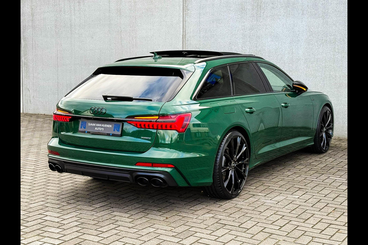 Quattro 4-wielaandrijving|S-Tronic Automaat|Audi Exclusive Sonoma Green Metallic|Dubbel Panoramisch glazen schuif-/kanteldak|Elektrisch bedienbare zonwering panoramadak V+A|Virtual Cockpit Plus|Grijs Valcona lederen Supersport schaalstoelen/ RS kuipstoelen incl. Diamond Cross stitching grijze stiksels|Elektrischverstelbare voorstoelen|Bestuurders stoel incl. geheugenfunctie / Memory|Elektrisch verstelbare lendensteun|Stuurwiel verwarming|Stoelverwarming|Geperforeerd lederen 3-spaaks S-line Sportstuurwiel incl. verwarming en Grijs stiksel|Audi Exclusive Alcantara airbag incl. Grijs stiksel|F1 schakelflippers|LED dagrijverlichting|LED HD Matrix koplampen met Dynamische lichtanimatie|LED achterlichten|3D / Dynamische knipperlichten voor- & achterzijde|Elektrisch bedienbare achterklep|Afstandswaarschuwing|ACC / Adaptieve Cruise Control|Lane Assist|Side Assist / Dodehoeksensor|HUD / Head Up Display|Grootlichtassist|Audi Pre Sense|Audi Magnetic Ride/ instelbare comfort Adaptieve dempingssysteem|Coming-/Leaving Home|Attention Assist|Licht- & Regensensor|Navigatiesysteem groot MMI Plus|Uitgebreide boordcomputer|Bluetooth|B&O / Bang & Olufsen look soundsysteem incl. Subwoofer|DAB+ / Digital Audio Broadcasting|Audi Connect Key|Voice Control|APP Connect|Apple CarPlay / Android Auto|Qi inductief / draadloos opladen smartphone|Audi Drive Select - Instelbare rijprofielinstellingen|Area View / 360° Camera|Vooruitrijcamera|Rear View / Achteruitrijcamera|Parkeersensoren voor- & achterzijde|Parkassist / Automatisch inparkeersysteem|19 inch S-line velgen|*Optioneel: Getoonde 22inch Black Performance velgen|Climate Control 4-zones|Keyless GO|Spiegelpakket - Elektrisch verwb.-/verstelb. + inklapbare buitenspiegels|Warmtewerende voorruit|Elektrische ramen voor- & achterzijde|Automatisch dimmende binnenspiegel- & buitenspiegels|Ambiance sfeerverlichting Premium|Audi Premium Sound incl. Subwoofer|RVS Sportpedalen|RVS S-line instaplijsten incl. LED verlichting|Zonneschermen zijruiten|Aluminium interieurlijsten|Privacy Glass|Black Pack / Zwart optiekpakket|Zwarte Audi emblemen rondom|Zwarte dakrailing|Hoogglans zwarte grille|Hoogglans zwarte raamomlijsting|Hoogglans zwarte Audi emblemen|Hoogglans zwarte buitenspiegels|Audi OEM Design Black S6 diffuser + Hoogglans zwarte uitlaat eindstukken|Rode Audi Sport S remklauwen|Voorruitverwarming incl. voorklimatisering|Standkachel / Interieurvoorverwarming fabrieksaf|Elektrisch wegklapbare trekhaak fabrieksaf|