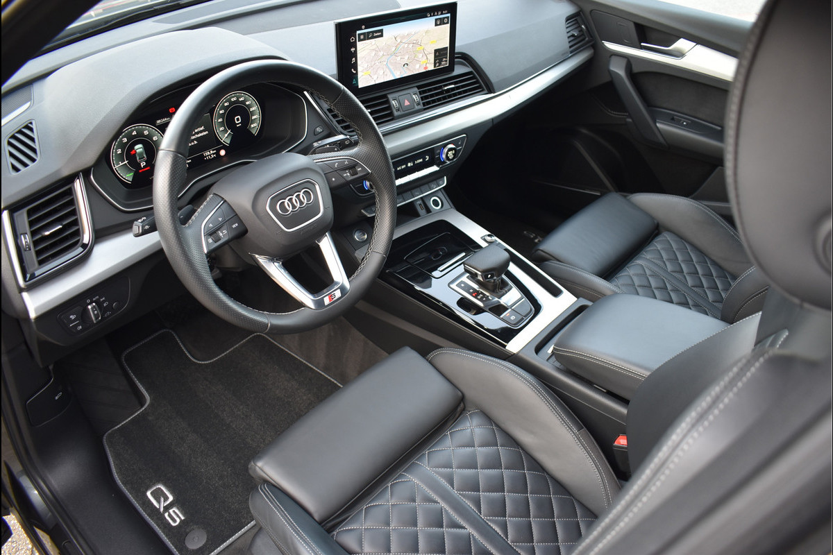 Audi Q5 50 TFSI e S-Line 299 Pk Black Edition 11-2021 met 79899 km DLR Onderhouden Daytona Grijs Metallic Opties: Matrix Full Led Koplampen (zandlopers) S-Line Exterieur/Interieur Pakket Black Optik Pakket Vol Lederen RS-Sportstoelen Elektrisch Verstelbaar Zwarte Hemel Navigatie Full Map Digitale Cockpit Groot Bang&Olufsen Soundsysteem Spiegels Elektrisch Inklapbaar Climate Control 3 Zone Achteruitrijcamera Parkeersensoren V+A DAB Radio Luchtvering met automatische Niveau Regeling Trekhaak Origineel Wegklapbaar ACC Adaptieve Cruise Control Lane Assistent Oled Achterlichten (zandlopers) Ambianceverlichting Draadloos Opladen Dodehoek Detectie Apple Carplay Elektrische Achterklep Keyless Entry/Start 20 Inch Audi Sport Velgen