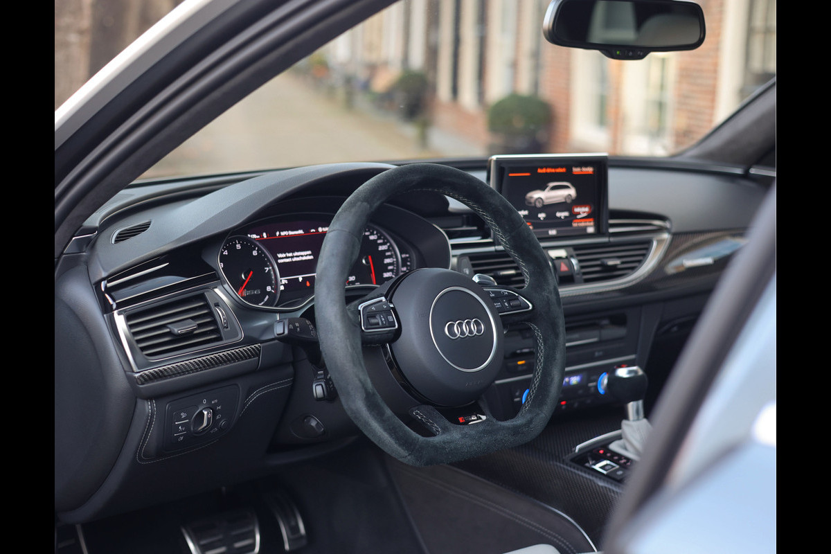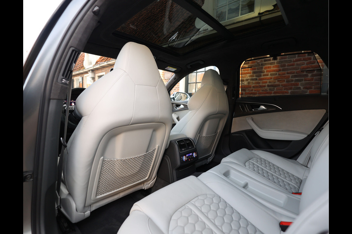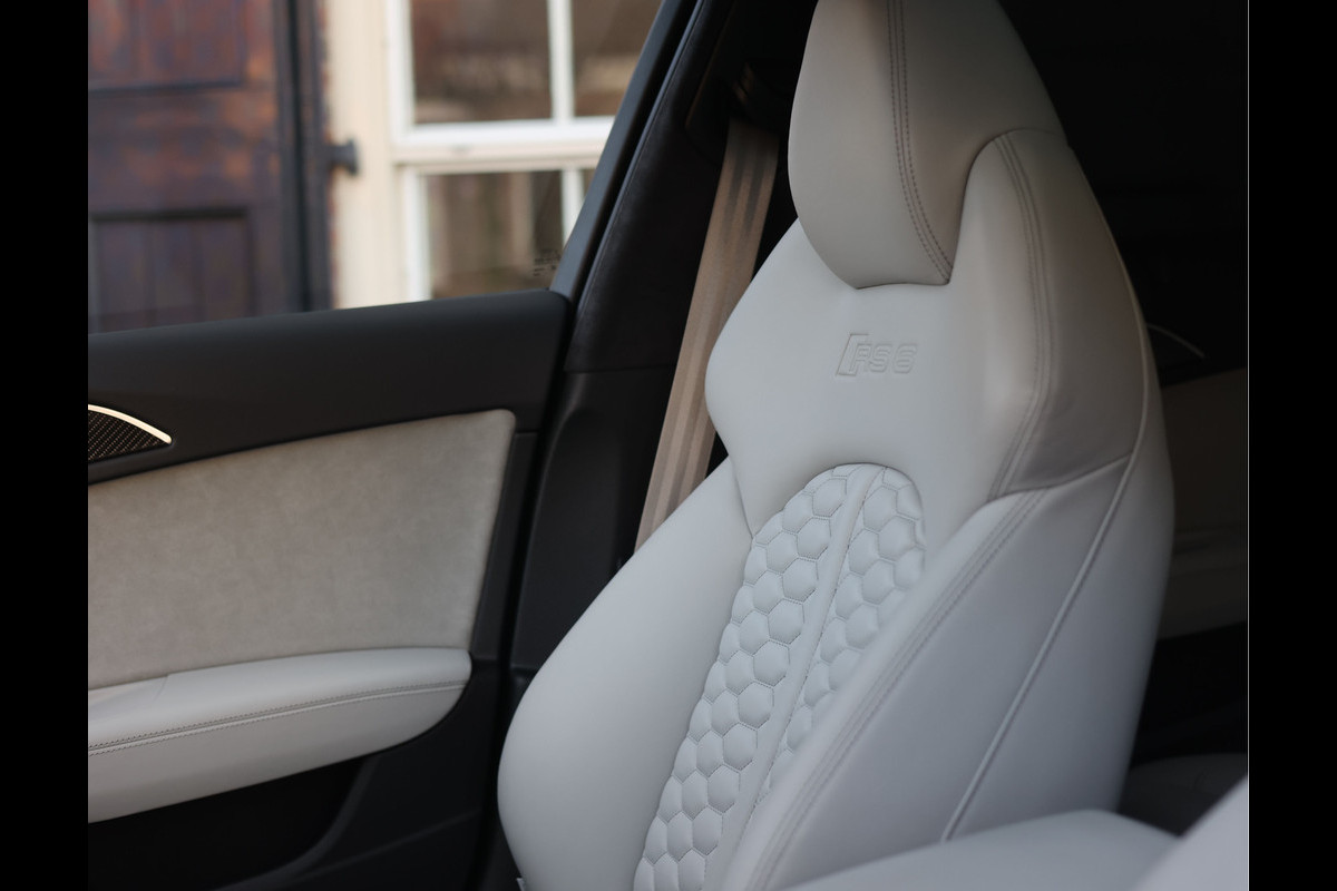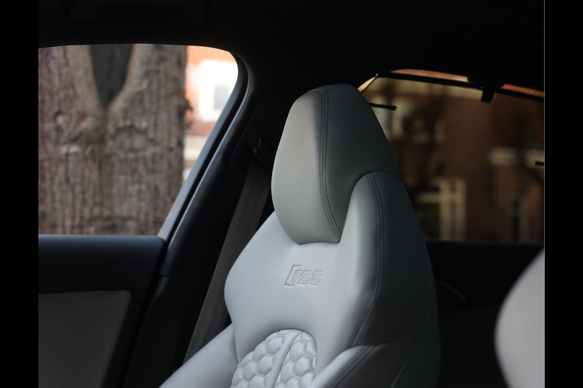 Binnenin gaat het feest verder, want wát een geweldige samenstelling is dit! De sportstoelen zijn bekleed met Moon Silver Valcona leder, voorzien van diamantstiksels en RS-logo’s. Ook hier is de auto tot in detail perfect samengesteld. Carbon interieurlijsten, een suède stuurwiel, Moon Silver leder om de automaatpook… Zelfs de Alcantara binnenhemel en de volledig lederen middentunnel zijn voorzien van contrasterende stiksels! 100 procent perfectie bestaat niet, maar deze RS6 komt extreem dicht in de buurt!