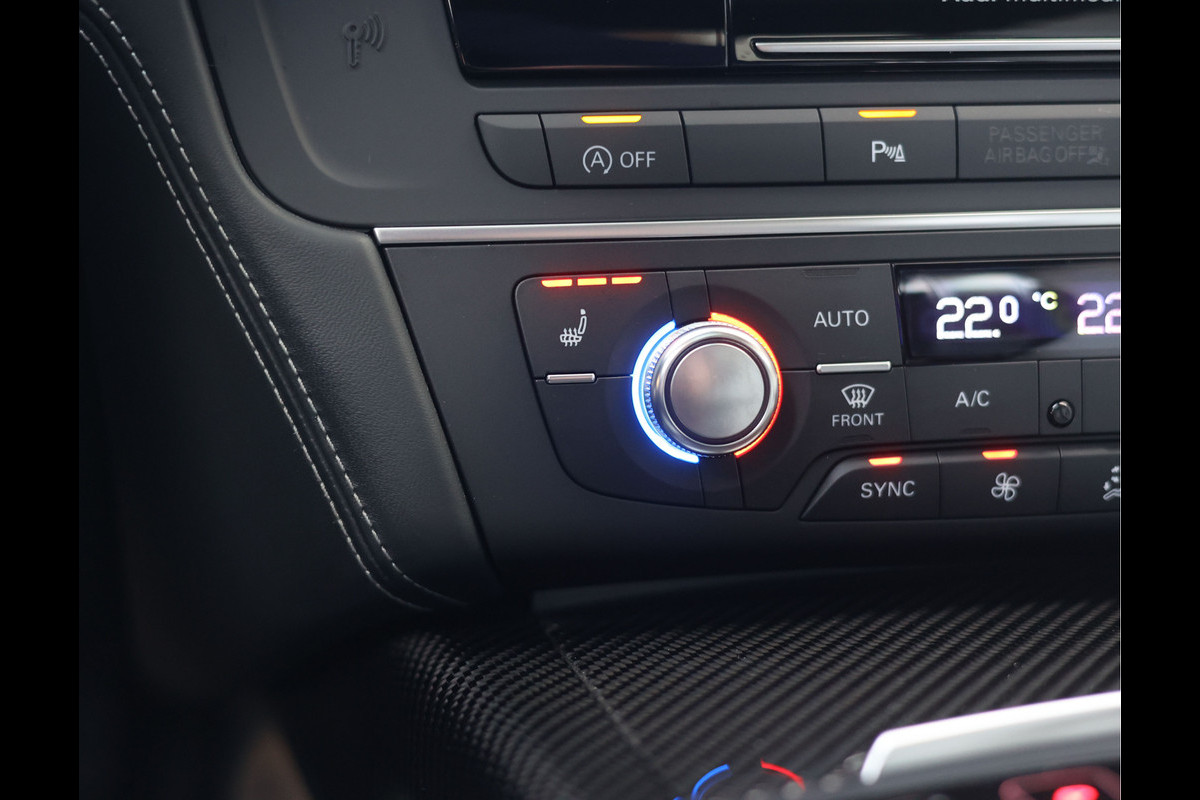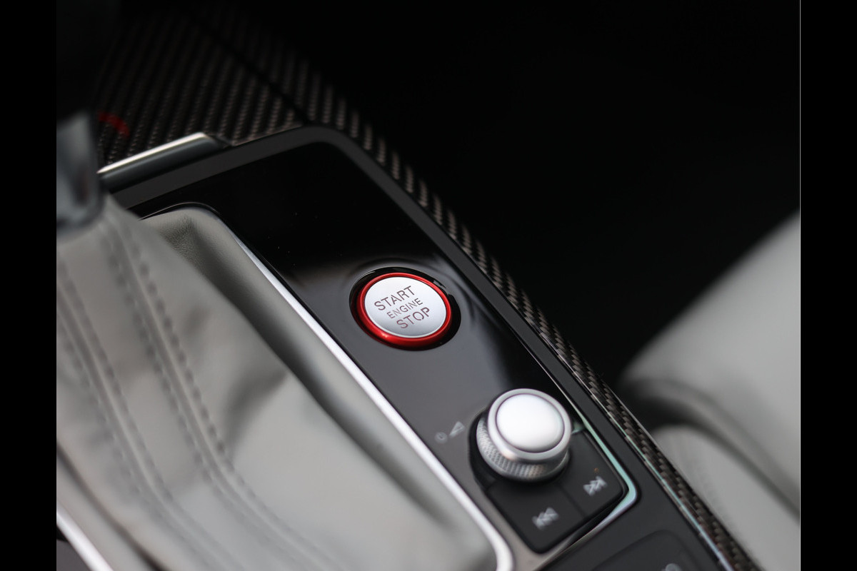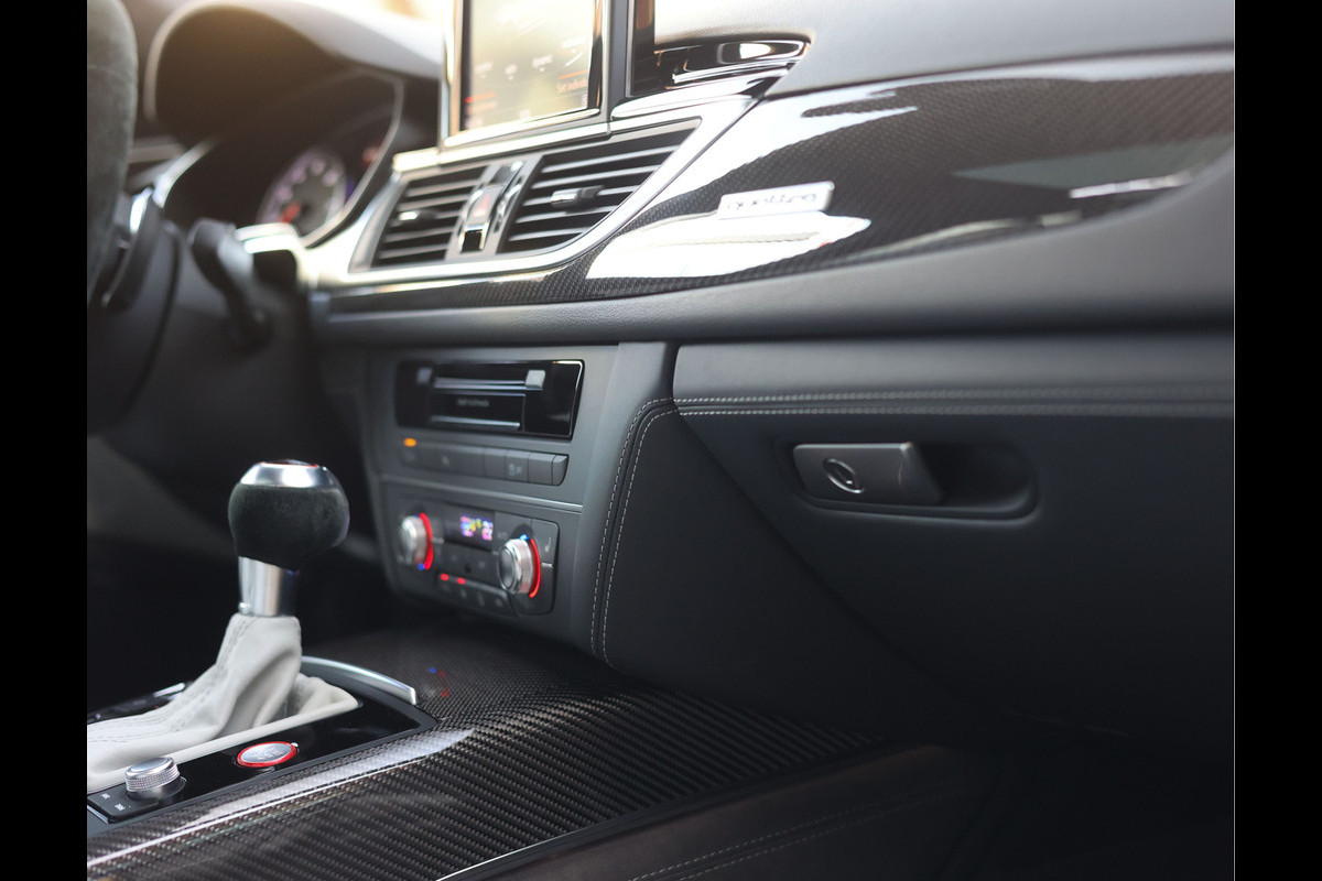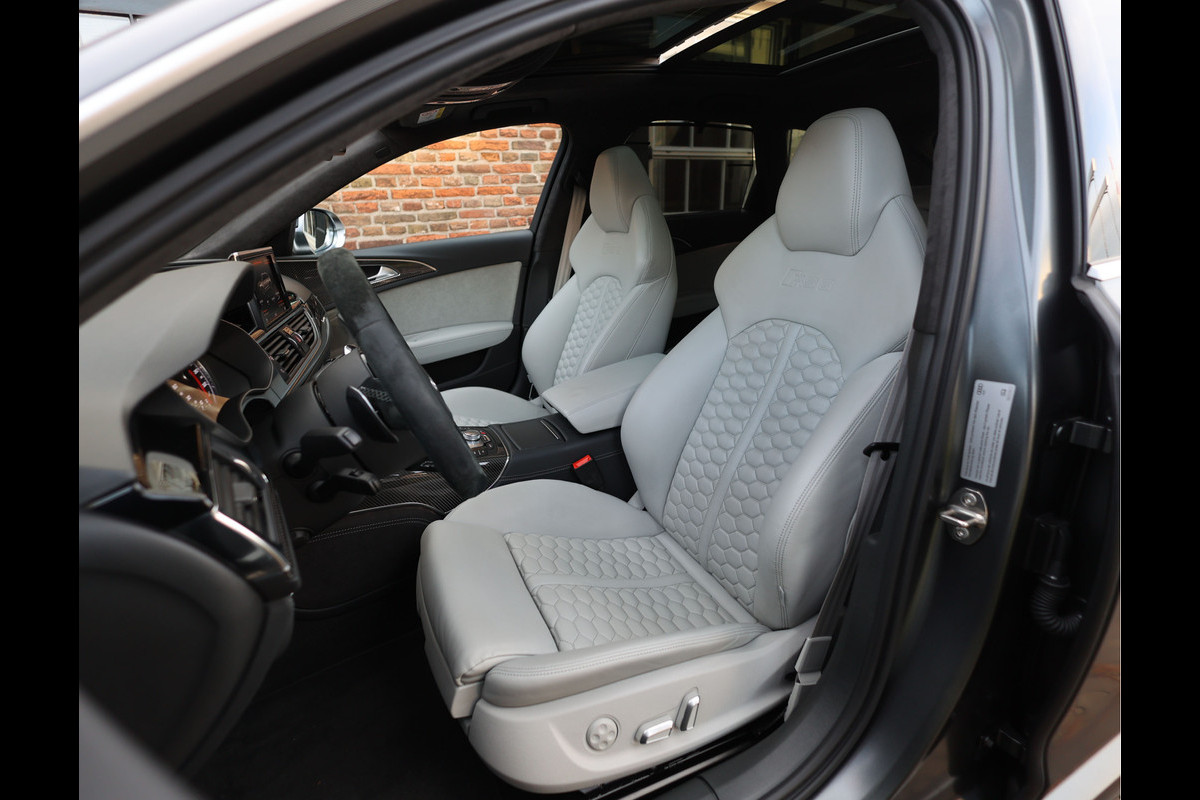 Binnenin gaat het feest verder, want wát een geweldige samenstelling is dit! De sportstoelen zijn bekleed met Moon Silver Valcona leder, voorzien van diamantstiksels en RS-logo’s. Ook hier is de auto tot in detail perfect samengesteld. Carbon interieurlijsten, een suède stuurwiel, Moon Silver leder om de automaatpook… Zelfs de Alcantara binnenhemel en de volledig lederen middentunnel zijn voorzien van contrasterende stiksels! 100 procent perfectie bestaat niet, maar deze RS6 komt extreem dicht in de buurt!