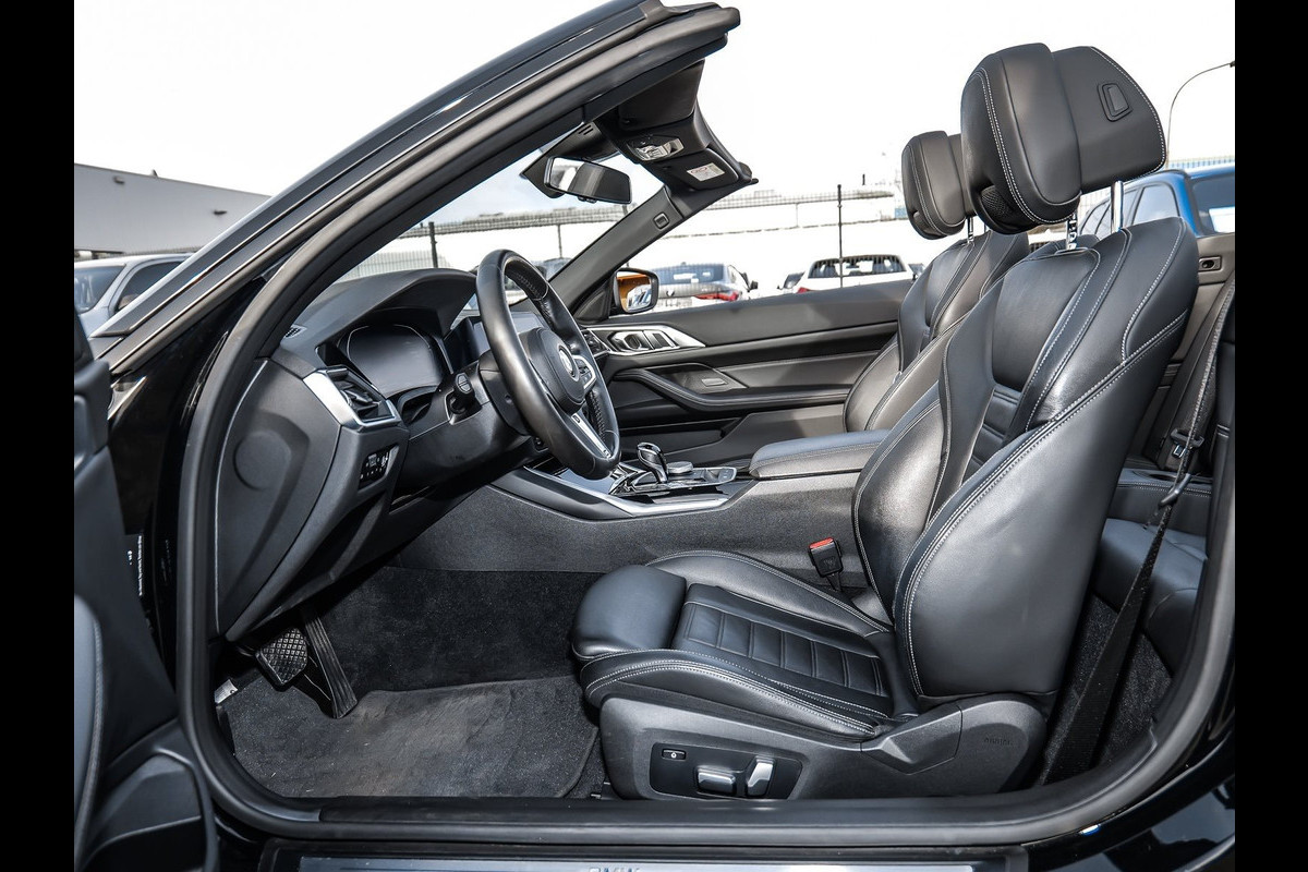 Uniek Fraaie BMW 420iA Cabriolet van 09-2021 met origineel 37.751km. gereden (1e EIG - UNFALLFREI & VOL. BMW ONDERH.) in het Schwarz II (Lakzwart) met een Schwarz (Grijze Stiksels) "Vernasca" Vol-Lederen Interieur (Sportstoelen Voor) die zeer rijk is uitgerust met o.a. de onderstaande opties & accessoires: Opbergpakket, ConnectedDrive Services (abonnement), ConnectedPackage Professional (abonnement), Open-Air Pakket, Actieve voetgangersbescherming, Alarmsysteem, De-activering passagiersairbag, Binnenspiegel Automatisch dimmend, Bandenspannings-controle, Gevarendriehoek, Hoogglans zwarte interieurafwerking, Automatische klimaatregeling 3-zones, Verwarmd Multifunctioneel Lederen M-Techniek sportstuur, Breedte Verstelbare rugleuning, Lendensteun, Verwarmde stoelen voor bestuurder en passagier incl. Nekverwarming, Winddeflector (cabriolet), Cruise control met remfunctie, Noodoproepsysteem, Park Distance Control (PDC) V&A, TeleServices, BMW Live Cockpit Professional, DAB Tuner, HiFi-luidsprekersysteem, Comfortabele telefonie met verbeterde smartphone-integratie, Wi-Fi-hotspot, 18-inch L.M. Velgen in "dubbele spaken 782 Bicolor / NLE" met Runflat-banden & Wielsloten, etc, etc....