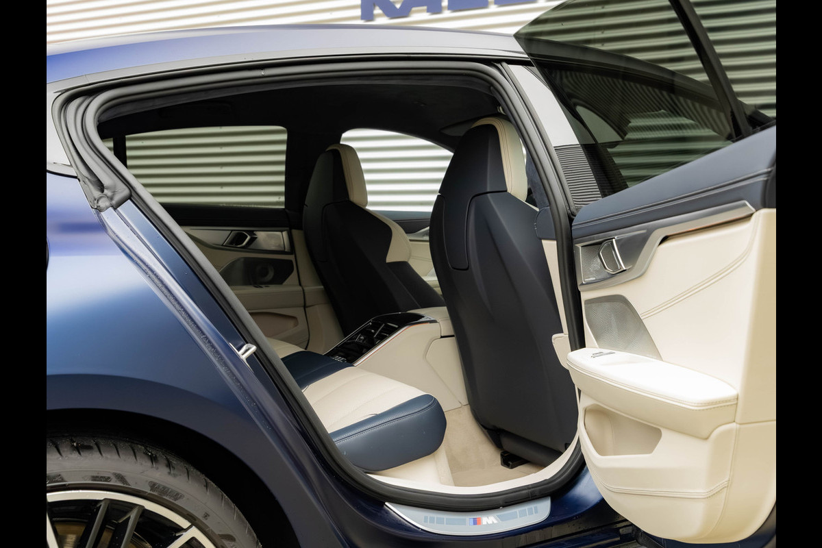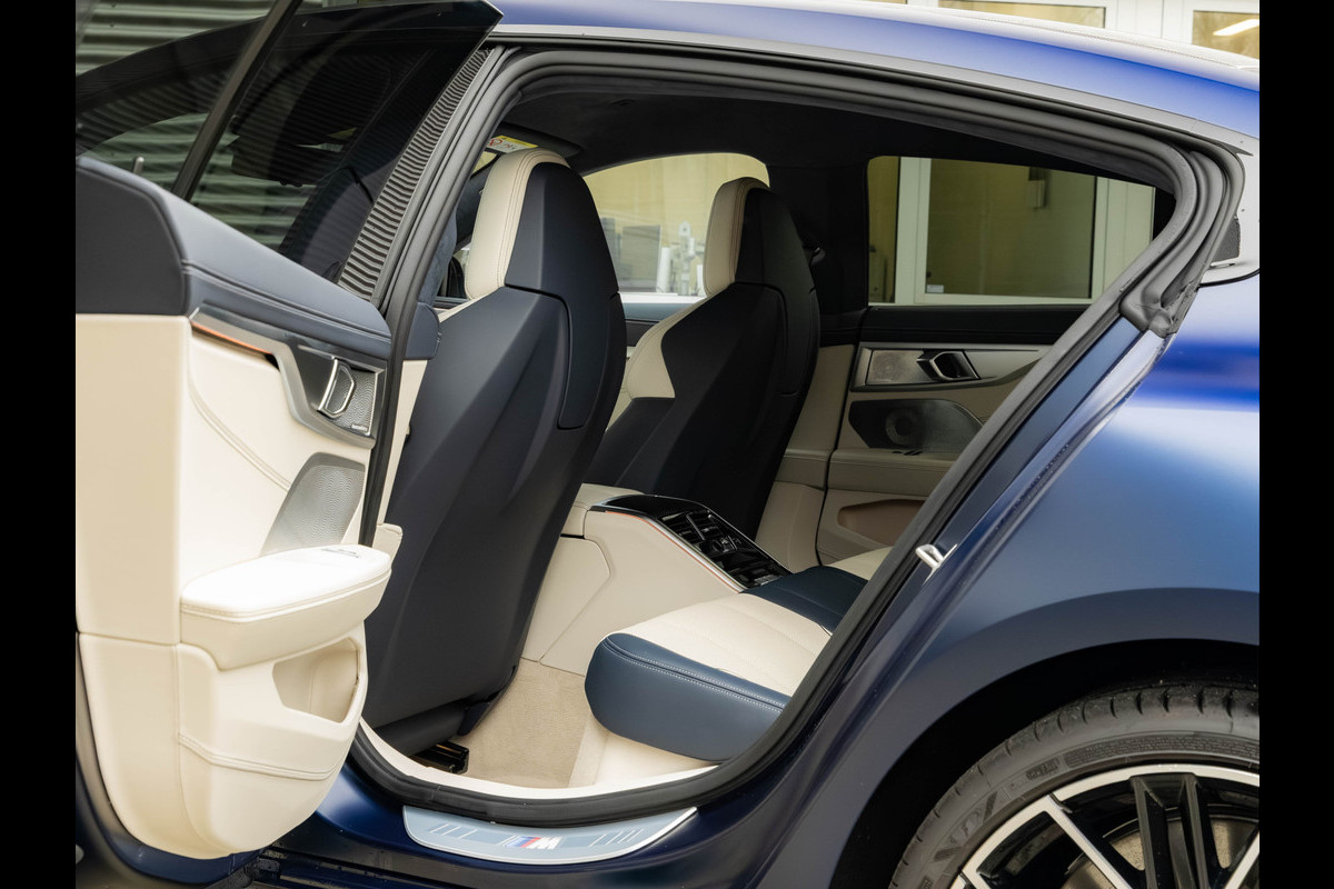Een BMW M850i Gran Coupé die tot in de puntjes klopt. BMW Individual Frozen Tanzanite Blau aan de buitenkant, en binnenin BMW Individual Merino volleder in Elfenbeinweiss met Nachtblau. Licht, donker, en ontzettend smaakvol.