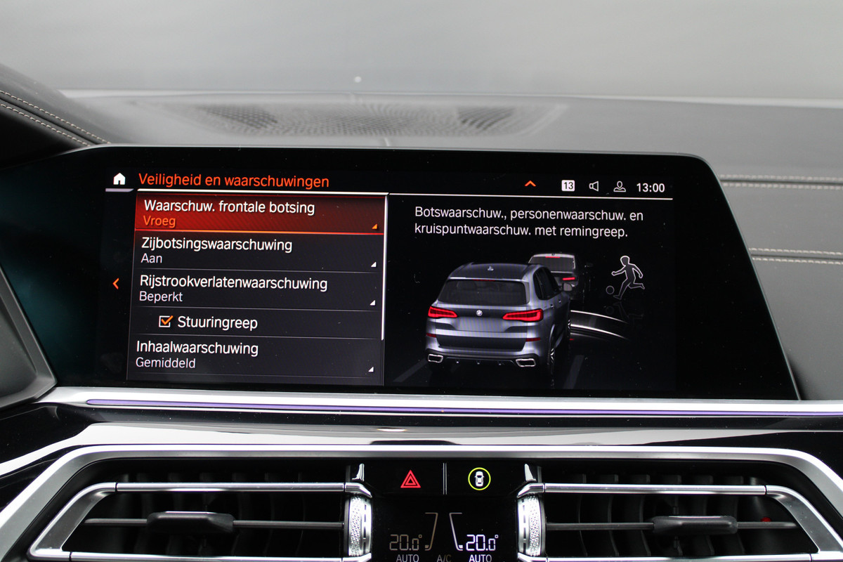 In de BMW X5 heeft uw veiligheid en die van uw omgeving prioriteit. Verkeersborddetectie herkent tijdelijke en permanente verkeersborden langs en boven de weg. Mooi binnen de lijnen van de rijstrook blijven? Het Lane-keeping systeem helpt altijd een handje. Hoe goed u ook oplet in het verkeer, de dode hoek blijft een risico. Gelukkig is deze BMW X5 voorzien van actieve dodehoekdetectie. Verder is deze auto uitgerust met head-up display, forward collision warning system, hill hold functie, vermoeidheidsherkenning, autonoom remsysteem en bandenspanningcontrolesysteem.
