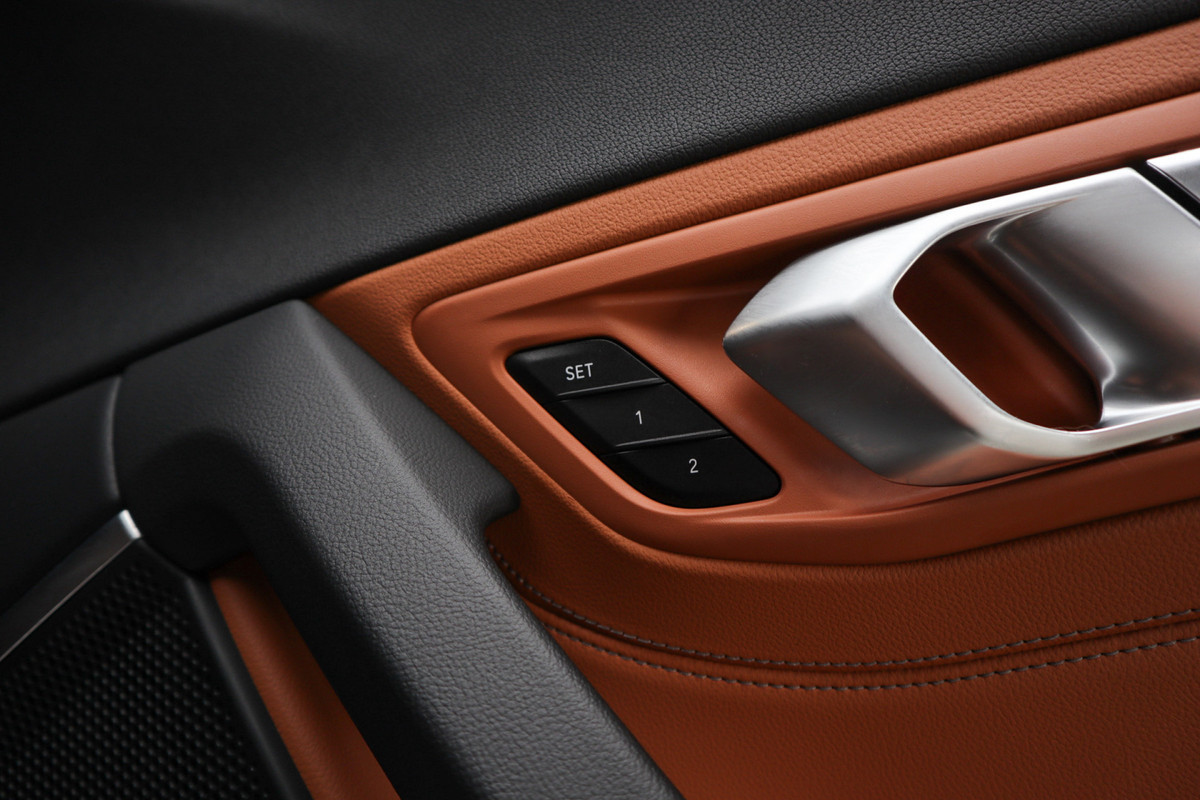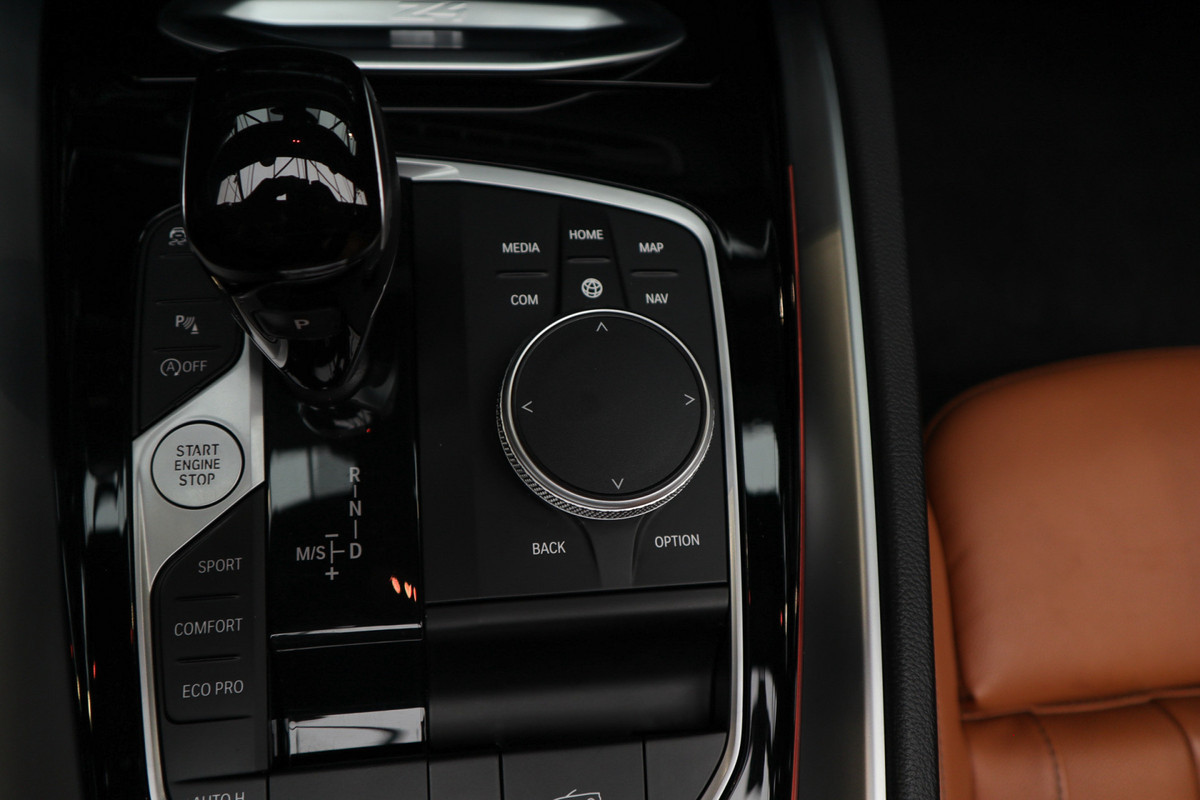 De Z4 valt op door zijn stijlvolle kleur (wit metallic), zwart cabriodak en zwarte lichtmetalen velgen, gecombineerd met het Vernasca Cognac interieur, zwarte vloeren en een zwart dashboard.