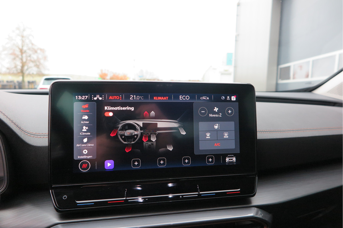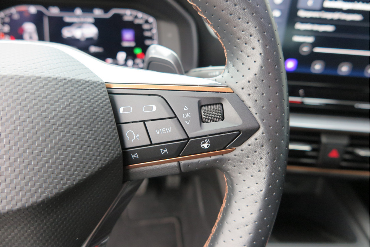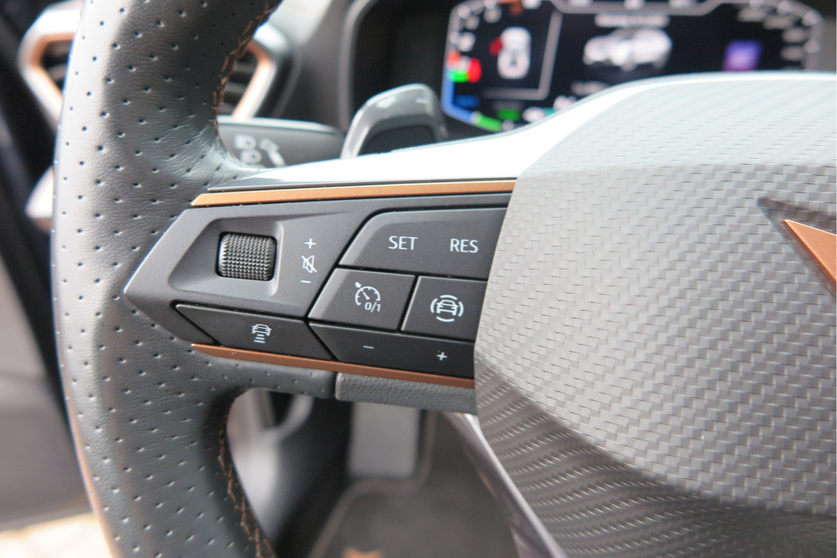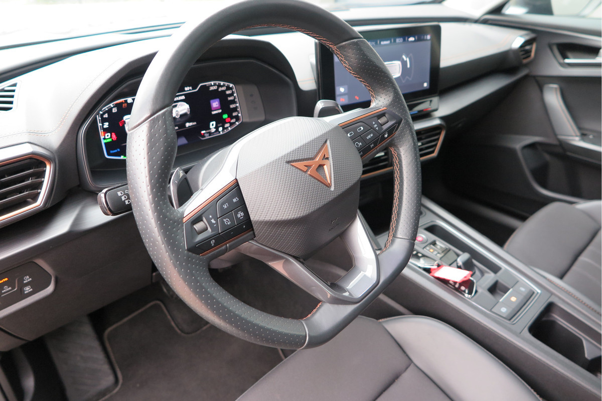 Omdat goed geïnformeerd rijden tegenwoordig om veel meer draait dan alleen snelheid en brandstofpeil, laat het digitale dashboard alle functies zien die u nodig heeft. Adaptive cruise control is een comfortabele en veilige optie. Het systeem reguleert de snelheid en houdt automatisch afstand tot uw voorligger. De meest gebruikte voertuigfuncties laten zich met behulp van uw stem bedienen. Deze CUPRA Formentor is voorzien van remote services. Via uw smartphone bedient u diverse functies ook op afstand en krijgt u informatie over de status van uw auto. Het navigatiesysteem is uw vertrouwde gids, waarheen de reis ook gaat. De CUPRA is standaard voorzien van: achteropkomend verkeer waarschuwing, automatische airconditioning, schakelpaddles aan het stuur, DAB ontvangst, parkeersensoren achter en regensensor.