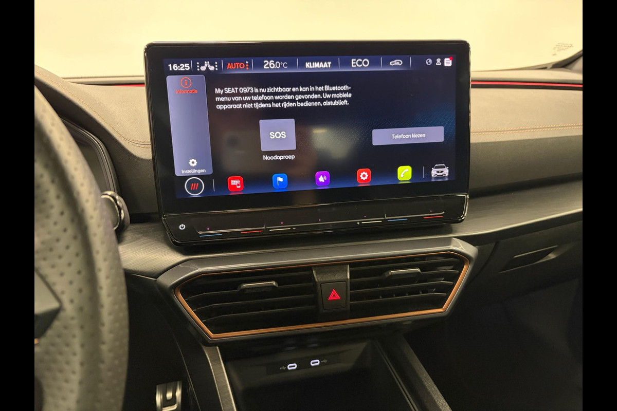 Deze Cupra is voorzien van verschillende intelligente veiligheidsvoorzieningen. Ze kijken tijdens het rijden als het ware met u mee, ze signaleren potentieel gevaarlijke situaties en in een aantal gevallen kunnen ze ook ingrijpen. In het instrumentarium ziet u tijdens de rit ook de belangrijkste verkeersborden aangegeven, die de auto automatisch voor u leest. Het Lane-keeping systeem zorgt voor een automatisch constante positie binnen de rijstrook. Afdwalen is uitgesloten. Het systeem van forward collision warning, of in gewoon Nederlands 'botswaarschuwing', treedt in werking als de sensor te weinig afstand signaleert met een voor- of tegenligger. Bovenop deze veiligheidsfeatures heeft deze Cupra bovendien dodehoekdetectie, accident avoidance system, hill hold functie, vermoeidheidsherkenning en bandenspanningcontrolesysteem.