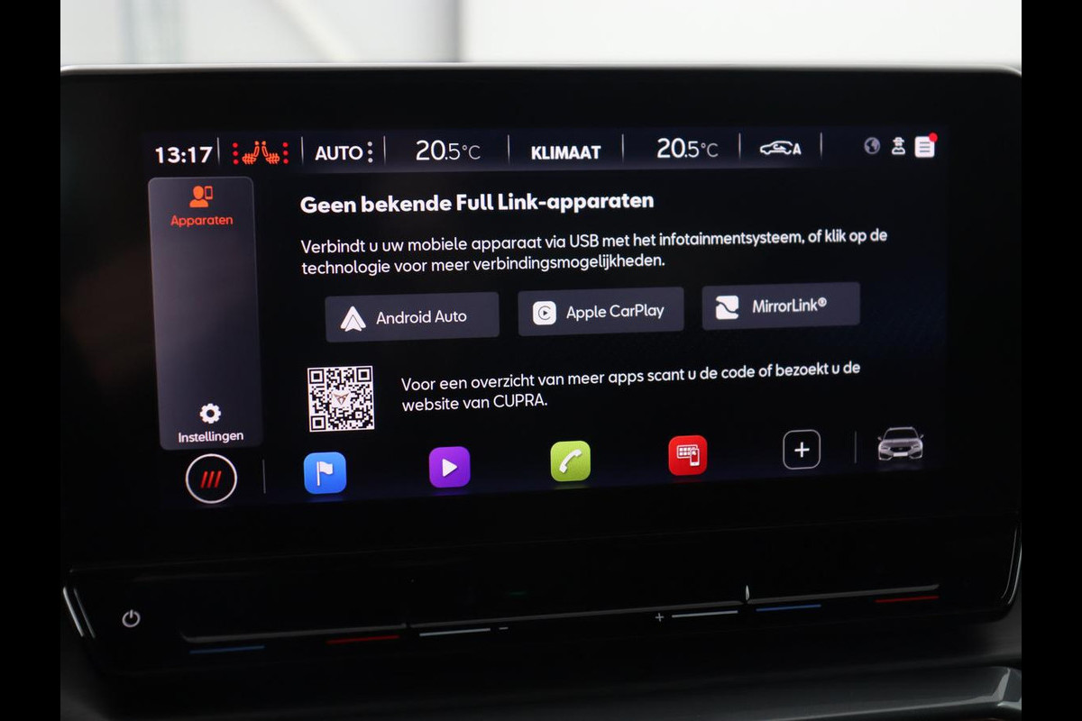 Rijfuncties worden glashelder en overzichtelijk weergegeven via het digitale dashboard. U weet altijd hoe de auto eraan toe is dankzij Connected Services. Ook handig voor de garage en de wegenwacht. Even de app uitlezen en klaar! Voor een veilige rit is het belangrijk dat uw handen het stuur vasthouden en uw ogen gefocust blijven op de weg; daarom kunt u het audiosysteem, met DAB-ontvangst en full map navigatiesysteem bedienen met het stuurwiel of via spraakbediening. Telefoon onderweg aan de lader? Daar komt geen kabeltje aan te pas, want deze CUPRA Leon is voorzien van een draadloze oplaadmogelijkheid voor telefoons. Tot de standaard uitrusting van deze auto hoort ook automatische airconditioning. Ook parkeersensoren achter, regensensor, cruise control, keyless entry, automatisch dimmende binnenspiegel en centrale deurvergrendeling met afstandsbediening zijn aan boord.