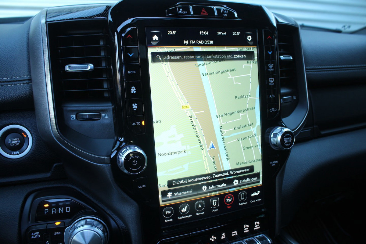 Wat een gemak, die achteruitrijcamera. Alles in beeld zonder capriolen. In deze Ram 1500 vindt u niet alleen schakelaars op het stuur om het audio-installatiesysteem te bedienen en het full map navigatiesysteem, maar er is ook spraakbediening. Het comfort wordt verhoogd door de aanwezige automatische airconditioning. Natuurlijk is er ook cruise control aan boord, waarmee u meer ontspannen en zuiniger rijdt. De sloten worden automatisch ontgrendeld dankzij de keyless entry. Fijne optie!