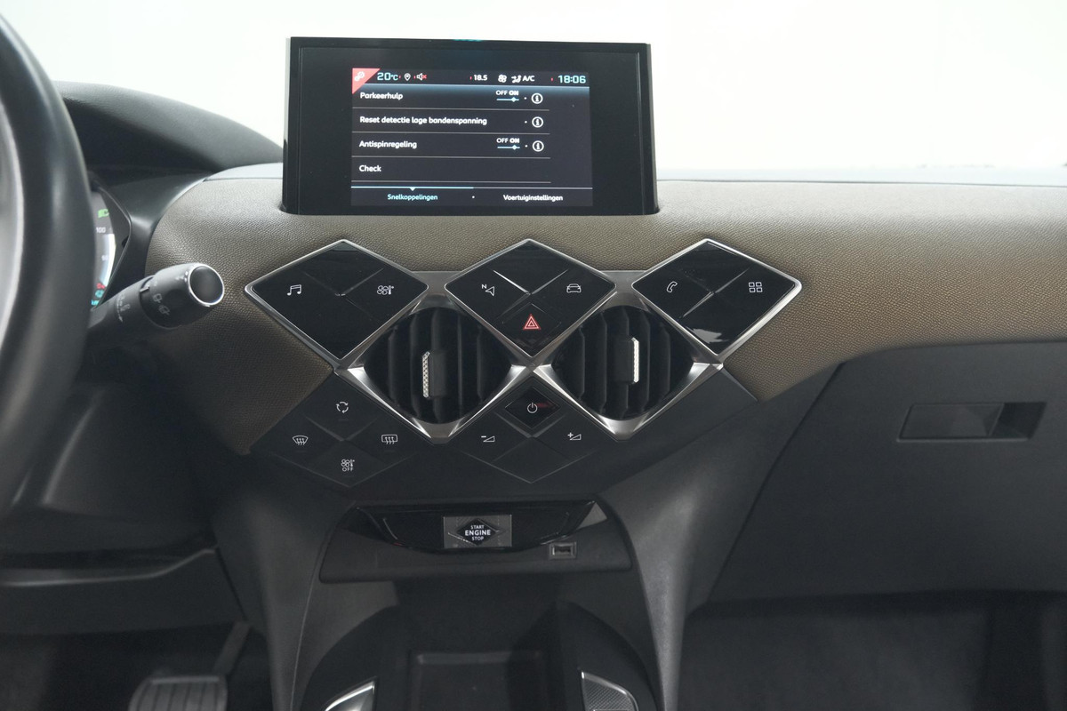 Het digitale dashboard vertelt u onderweg alles dat bijdraagt aan een veilige, efficiënte rit. Een handige optie is de achteruitrijcamera. Achteruitrijden, inparkeren en manoeuvreren gaat gemakkelijker dan ooit. Vanaf elke plek contact maken met deze auto: dat kan met behulp van remote services, die u simpel activeert met uw smartphone. Niet alleen is er aan boord DAB-radio beschikbaar, maar het audiosysteem zorgt ook nog eens voor fantastische weergave. Achter het stuur van deze DS bent u niet alleen. De auto kijkt als het ware met u mee tijdens de rit. De regensensor schakelt de ruitenwissers in als het nodig is en de automatisch inschakelbare verlichting doet de lichten voor u aan. En deze auto heeft ook cruise control, airconditioning, automatisch dimmende binnenspiegel, lederen stuur, centrale deurvergrendeling met afstandsbediening en boordcomputer als standaard uitrusting.