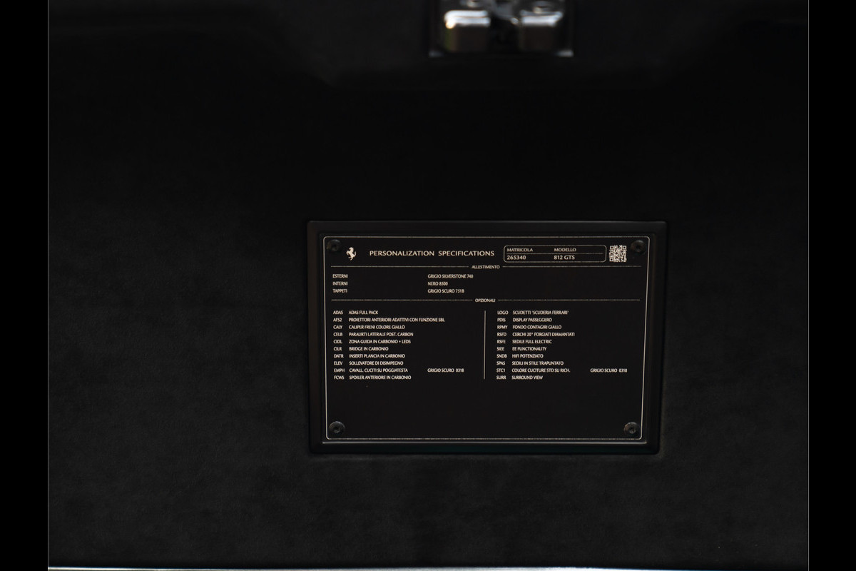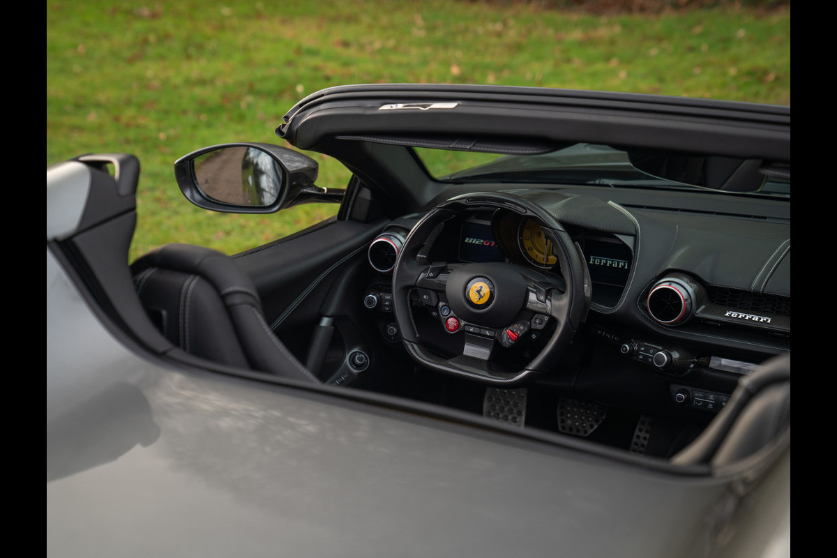 De Ferrari 812 is de natuurlijke opvolger van de F12, maar qua power gaat hij de circuit-geprepareerde TDF-versie voorbij. Het verklaart meteen de heftigere looks van de 812: de luchtsleuven zijn groter, de diffusor is imposanter en de aerodynamica nóg geavanceerder. De gesloten “Superfast” en half-open GTS plakken aan het grijze lint alsof ze één zijn met het wegdek. Maar het oog wil natuurlijk ook wat. En laten de Italiaanse designers hier nu net in excelleren… Hoe extreem de 812 ook op performance is gericht, het weerhoudt Ferrari er niet van om ‘m uiterst fraai te verpakken. In dit specifieke geval is er een extra elegant sausje overheen gegoten, luisterend naar de naam Grigio Silverstone – tóch weer die connectie met het circuit, dus. Vanwege de Scuderia Ferrari Shields en diverse carbon exterieurdetails ligt de link naar de racerij er extra dik bovenop. Onder andere de frontspoiler en elementen rondom de 4 uitlaateindstukken zijn carbon-made. Overigens is het geel uit de schilden op de voorschermen niet op zichzelf staand: de remklauwen achter de 20 inch grote Forged Diamond velgen kleuren namelijk ook Giallo…