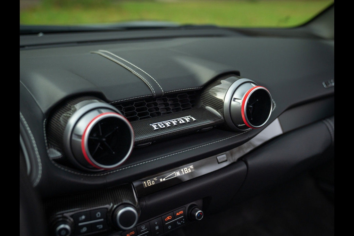 Binnenin niet alleen Ferrari geel, maar ook Ferrari rood: de ringen rondom de ventilatieroosters hebben een Rosso touch. En belangrijker: ze worden omhuld door peperduur carbon. Net als de Central Bridge en Driver Zone. Laatstgenoemde omvat onder ander het stuurwiel (inclusief LED Shift Indicator), de schakelflippers en de bediening náást het stuurwiel. Voor de rest bestaat de aankleding vooral uit Nero leder; dashboard, portieren én stoelen zijn ermee afgewerkt. De Grigio Scuro stiksels bieden een subtiel contrast, en zijn in vrijwel alle lederen delen toegepast. Tot en met de zonnekleppen en Cavallino’s in de hoofdsteunen aan toe.