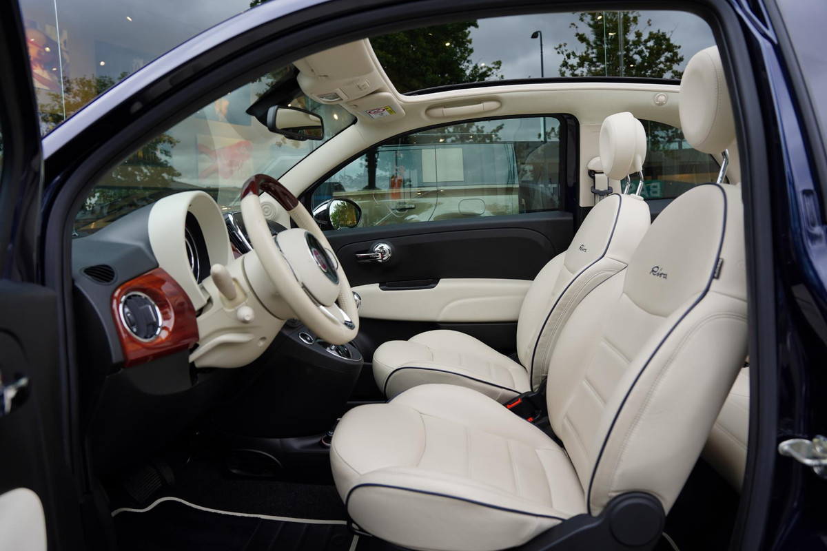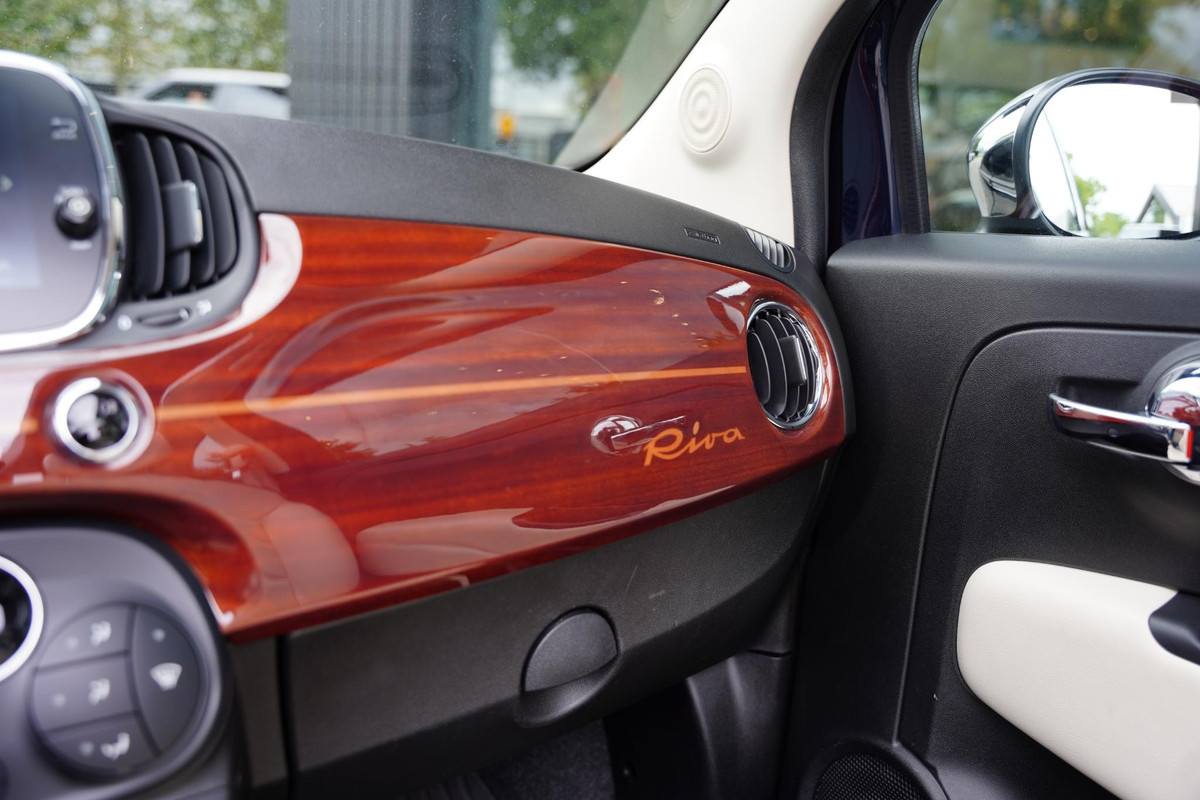 Wat maakt de Fiat 500 Riva zo bijzonder? Het Italiaanse autootje is voorzien van ontelbare nautische accenten. Alleen al de kleur is fraai: Sera blue. Het is een lakkleur die je ook terugziet op de ‘Aquarama’ van Riva, haar meest bijzondere speedboot. De twee mintgroene strepen aan de buitenkant symboliseren de samenwerking die Fiat heeft met Riva. Het logo van de 500 zie je verder terug in het mahoniehout aan de buitenkant. Daarnaast bezit de Fiat 500 Riva 16 inch lichtmetalen wielen in de kleur Sera Blue.