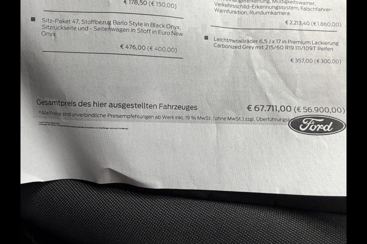 De geavanceerde technologie in deze Ford is in staat om onderweg het verkeer om u heen te monitoren en er op te reageren. Zo hebt u als het ware een automatische co-piloot aan boord. Bij de veiligheidssystemen van deze Ford hoort ook de verkeersbord-detectie. Die leest tijdens het rijden als het ware met u mee en attendeert u op de significante verkeersborden langs en boven de weg. Ongemerkt buiten de rijstrook raken? Nee hoor, het Lane-keeping systeem waarschuwt en corrigeert. Als een fiets of ander voertuig zich in de dode hoek bevindt, waarschuwt het actieve dodehoekdetectie. Dit helpt ernstige ongelukken voorkomen. Verder is deze auto uitgerust met forward collision warning system, hill hold functie, autonoom remsysteem en bandenspanningcontrolesysteem.