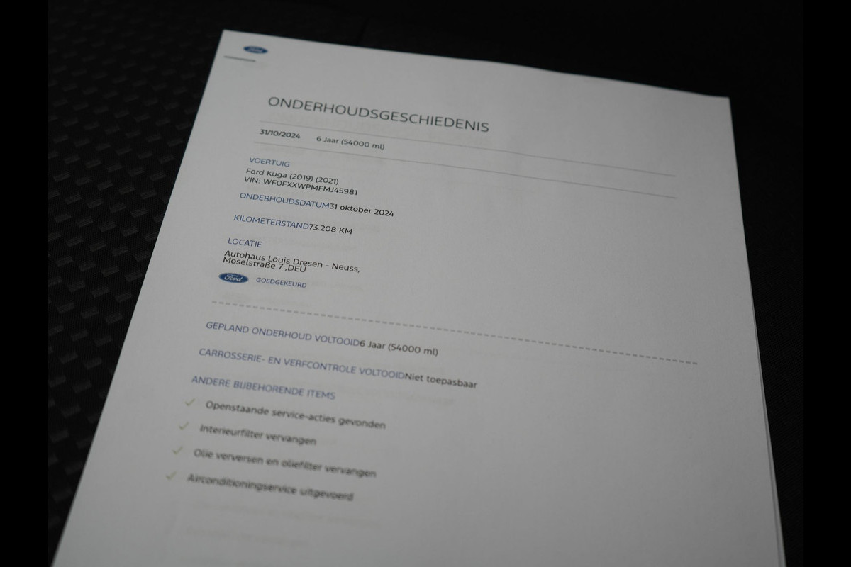 Het eigentijdse interieur wordt natuurlijk helemaal volmaakt met het digitale dashboard. De vier camera's die samen de 360 graden camera vormen, bieden u de mogelijkheid om obstakels in elke richting te zien. Uw smartphone is tegenwoordig de sleutel tot heel veel. Ook voor deze auto. Remote services, noemen we dat. Waar u ook bent, contact houden is een eitje. In deze Kuga vindt u niet alleen schakelaars op het stuur om het full map navigatiesysteem te bedienen en het audiosysteem met DAB-ontvangst, maar er is ook spraakbediening. Qi is de standaard om uw telefoonaccu zonder snoer weer op 100% te krijgen. Met de draadloze oplaadmogelijkheid voor telefoons. En deze auto heeft ook WIFI-hotspot, achteropkomend verkeer waarschuwing, automatische airconditioning, regensensor, cruise control en sportstuurwiel als standaard uitrusting.