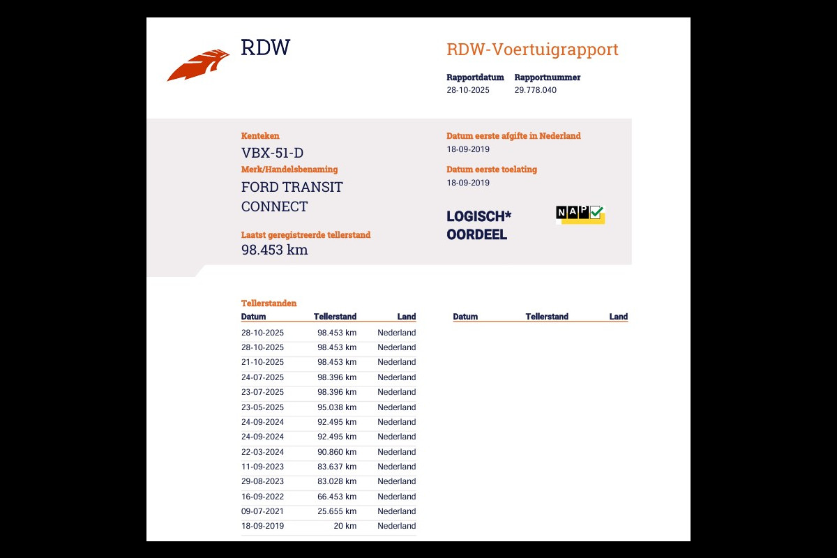 Er is ook een tellerrapport van Nationale Autopas, dat geeft u zekerheid over de kilometerstand van deze auto. Bent u nieuwsgierig naar deze Ford Transit Connect? Laat het ons dan snel weten.