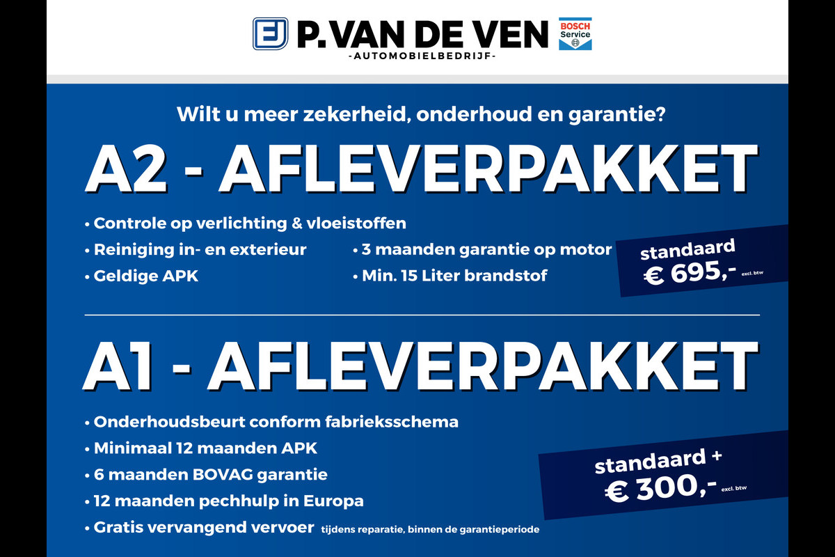 Optioneel afleverpakket (zonder meerprijs): A1 - Afleverpakket personenauto: Bij P. van de Ven kunt u er vanuit gaan dat elke auto een grondige inspectie heeft gehad. We kunnen u precies vertellen wat we gezien hebben zodat u weet wat u koopt. Wilt u extra zekerheid? Dat kan met het A1 - afleverpakket. Hierbij krijgt u aanvullende zekerheden tegen een meerprijs van €695. Hieronder leest u welke zekerheden het A1 afleverpakket allemaal bevat. - 12 maanden A1 (BOVAG) garantie - Onderhoudsbeurt conform fabrieksschema - Minimaal 12 maanden APK - Uitgebreide inspectie op 130 punten - Reiniging in- en exterieur - Minimaal 15 liter brandstof - 12 maanden Pechhulp in Europa - Gratis vervangend vervoer tijdens reparatie, binnen de garantieperiode Ook is het mogelijk deze auto geheel of deels te financieren. Vraag naar de voorwaarden. Nieuwsgierig geworden naar deze prachtige auto? Neem gerust contact op met onze verkoopadviseurs voor een afspraak en een overtuigende proefrit! Contactgegevens: 0497-591766 verkoop@pvandeven.nl Graag tot ziens!