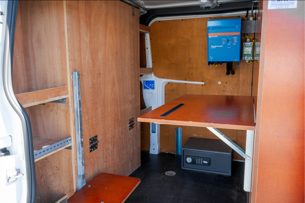 Bij deze Ford Transit Custom is de laadruimte ingedeeld in twee compartimenten. Een zit gedeelte met een tafeltje waar men rustig kan gaan zitten werken en waar je beschikt over stroomvoorziening. Het tweede gedeelte is handig in gedeeld met werkplaatsinrichting en ook hier beschik je over een stroomaansluiting en een bankschroef. Mocht u dit niet nodig hebben dan demonteren wij dit kosteloos voor u. De laadvloer is voorzien van afvoerdeksel waardoor u makkelijk en eenvoudig de laadruimte kunt schoonhouden. Het plafond is voorzien van een dak ventilator waardoor er geen kans is op schimmelvorming. Verder is de prachtige verlengde Ford Transit Custom een praktische en veelzijdige bedrijfswagen, voorzien van LED-verlichting, cruise control, stoelverwarming voor bestuurder en passagier en parkeersensoren voor en achter (PDC), wat zorgt voor extra comfort en gemak tijdens het rijden en parkeren. De rechter zijschuifdeur maakt laden en lossen eenvoudig en de trekhaak biedt extra inzetmogelijkheden. Daarnaast is deze uitvoering voorzien van een zwaailicht. Verder beschikt deze bedrijfswagen over bluetooth telefoonvoorbereiding, een multifunctioneel stuurwiel en een start/stop systeem, wat bijdraagt aan efficiënt brandstofverbruik. Tot slot is de auto uitgerust met een bedrijfswageninrichting met bankschroef, waardoor deze direct inzetbaar is voor diverse werkzaamheden.