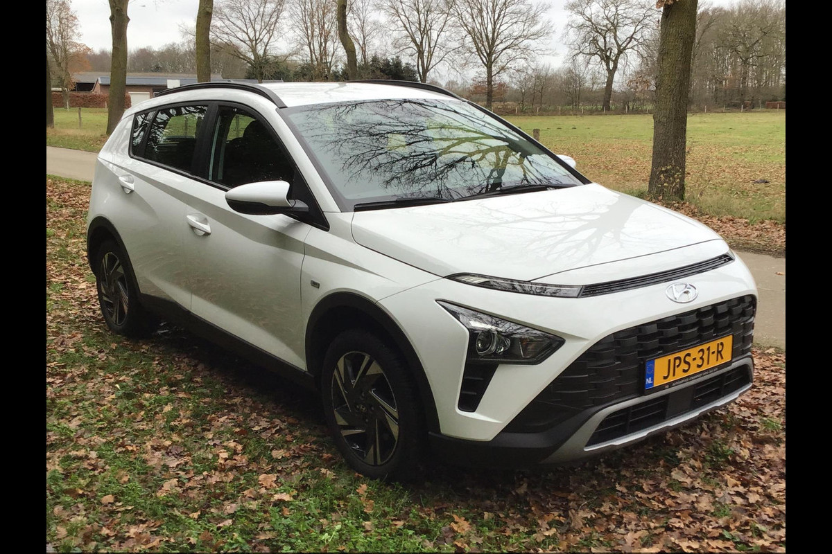 Deze witte Hyundai Bayon is een compacte maar verrassend ruime auto met een geweldig rijcomfort. De hybride-aandrijving zorgt in combinatie met de automaat voor prima prestaties en rijgedrag.
