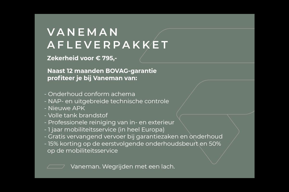 Dit afleverpakket bevat: Geldige APK, RDW-leges, Wettelijke garantie - Bovag garantie (zonder meerprijs): Dit afleverpakket bevat (in plaats van afleverpakket "Basispakket"): BOVAG garantie (12 maanden)