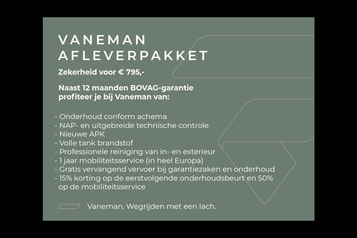 - Bovag garantie (zonder meerprijs): Dit afleverpakket bevat (in plaats van afleverpakket "Basispakket"): BOVAG garantie (12 maanden)