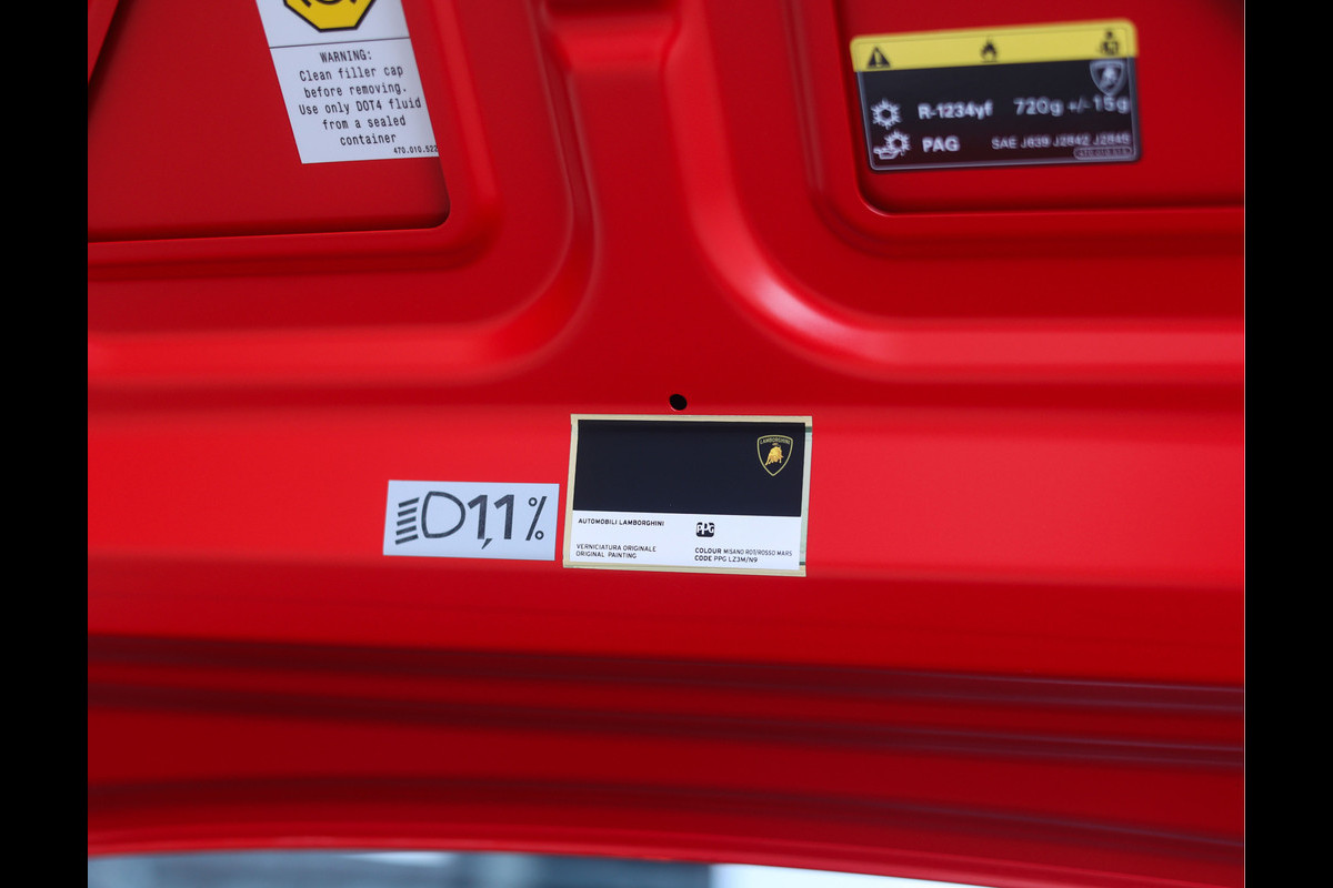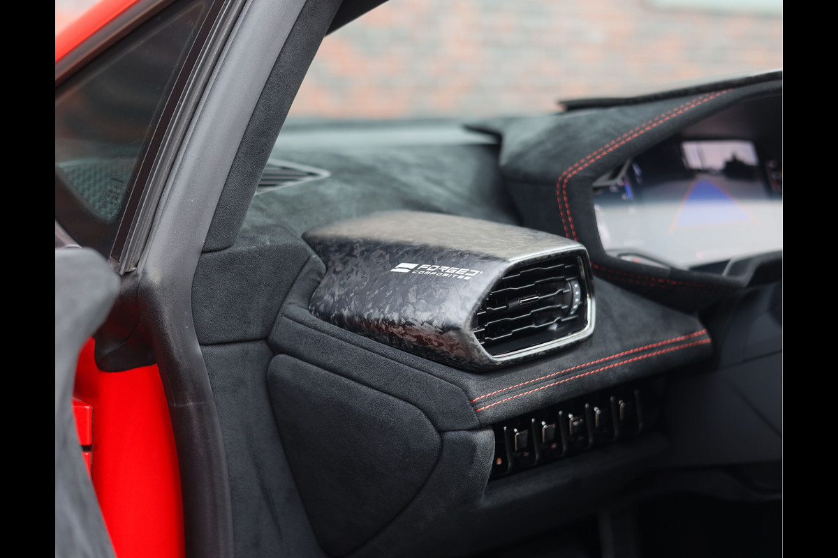 Laten we beginnen met het exterieur. Dit exemplaar is uitgevoerd in Misano Rood, wat de auto prachtig staat. Het design komt geweldig tot zijn recht. Messcherpe lijnen, brede heupen en forged carbon accenten maken deze Huracan extra opvallend. Dat het een Performante betreft is meteen duidelijk dankzij de grote achterspoiler en uitlaten die boven de achterbumper uitsteken. Om het plaatje compleet te maken staat de auto op bronzen velgen met daarachter rode remklauwen en vinden we de kleuren van de Italiaanse vlag op de zijkanten.