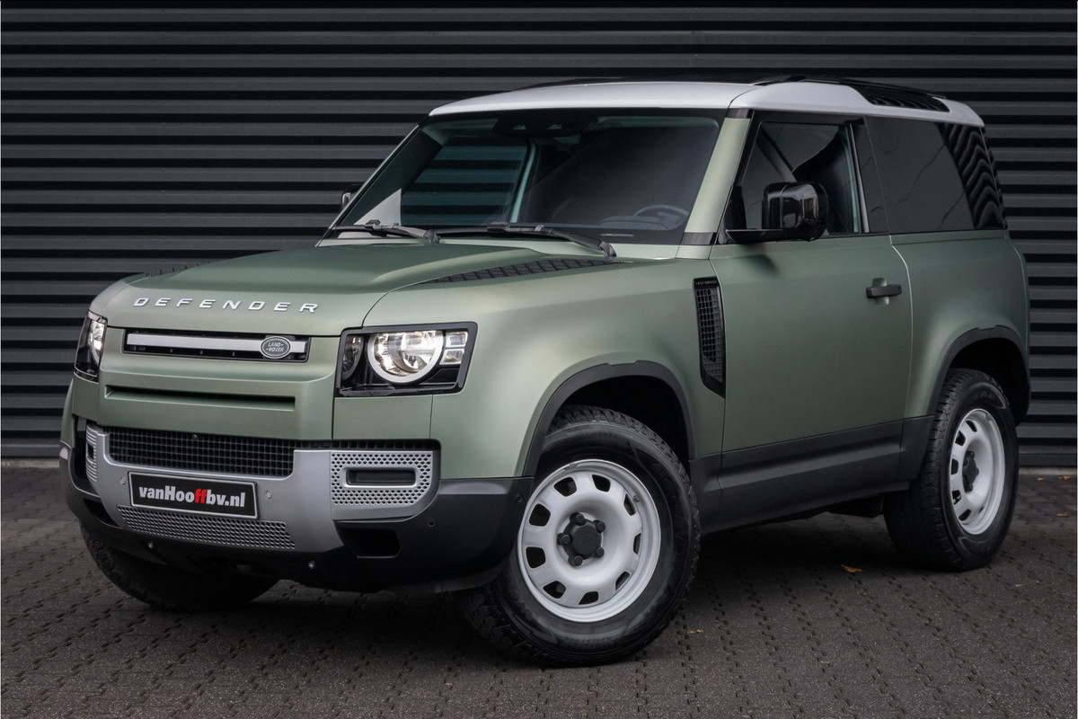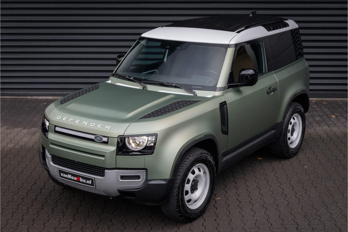 De Defender is gewrapt in een prachtige satijn groene kleur. Origineel is de auto Fuji White.