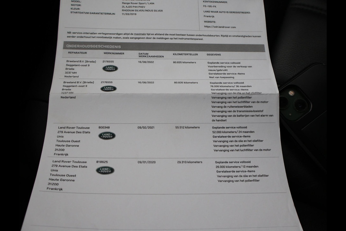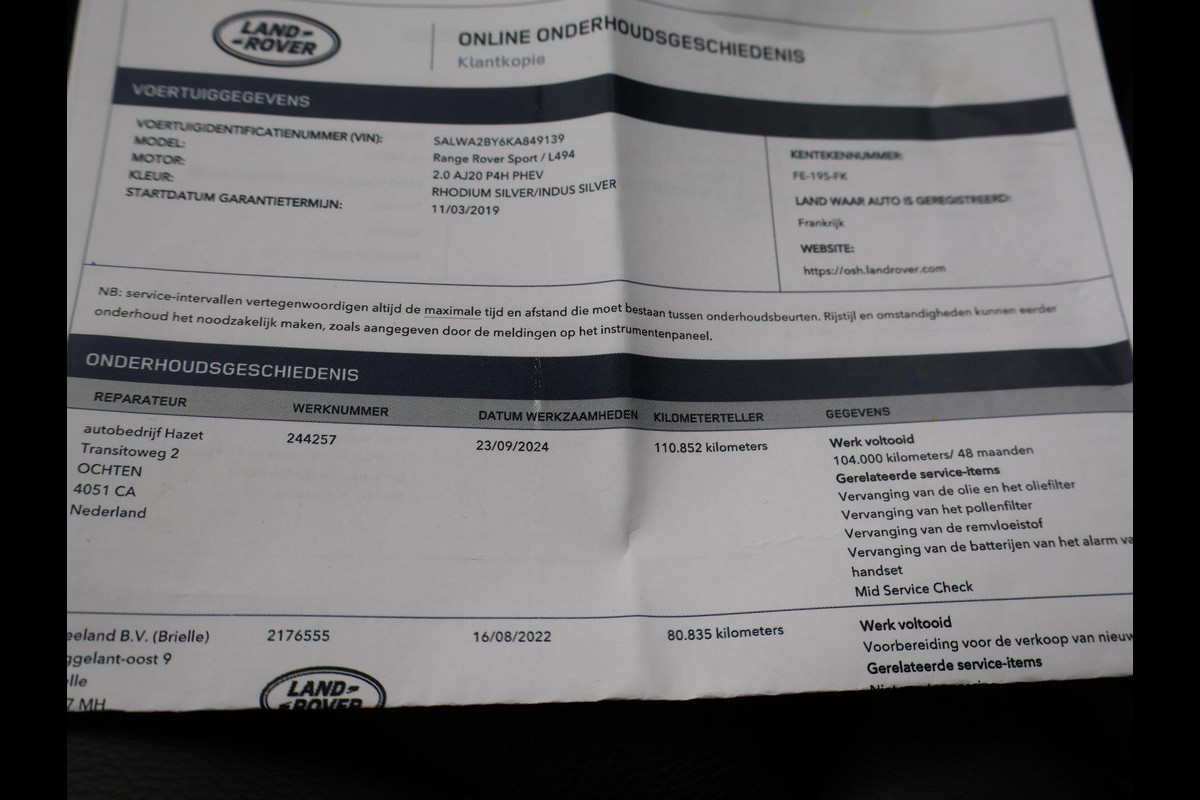 P400e PHEV plug-in hybride met de 2.0 viercilinder benzinemotor met elektromotor Gecombineerd vermogen: 404 PK. AWD vierwielaandrijving, BTW verrekenbaar, Volledig dealer onderhouden, Digitale onderhoudsbewijzen aanwezig online bijgehouden bij Land Rover tot en met 2024, RDW nieuwprijs 109.123 euro, Indus Silver metallic, Volledig digitale cockpit met mogelijkheden voor 1 of 2 tellers of geen tellers en beeldvullende kaartweergave, Apple Carplay / Android Auto appstreaming Google Maps, Spotify, Flitsmeister, TuneIn radio, Whatsapp etc, Meridian premium sound 825 Watt systeem, Elektrisch panoramadak, Head-up display projectie tegen voorruit, 21 inch hoogglans zwarte velgen origineel Land Rover, Privacy glass, Luchtvering met niveauregeling, Lijnassistentie, Climate control, Full LED Premium koplampen, LED achterlichten, All Terrain regelbare rij-eigenschappen afgestemd op de ondergrond, Achteruitrijcamera en parkeersensoren voor + achter, Down hill control, Low Range / Lage gearing, Wi-Fi hotspot.