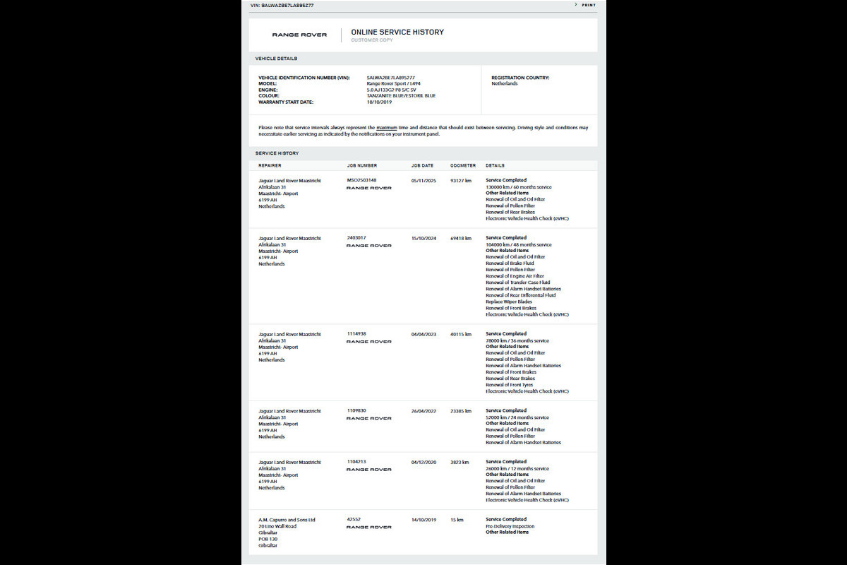 Altijd in onderhoud geweest bij de landrover dealer, waar hij november 2025 zijn laatste grote beurt heeft gehad.