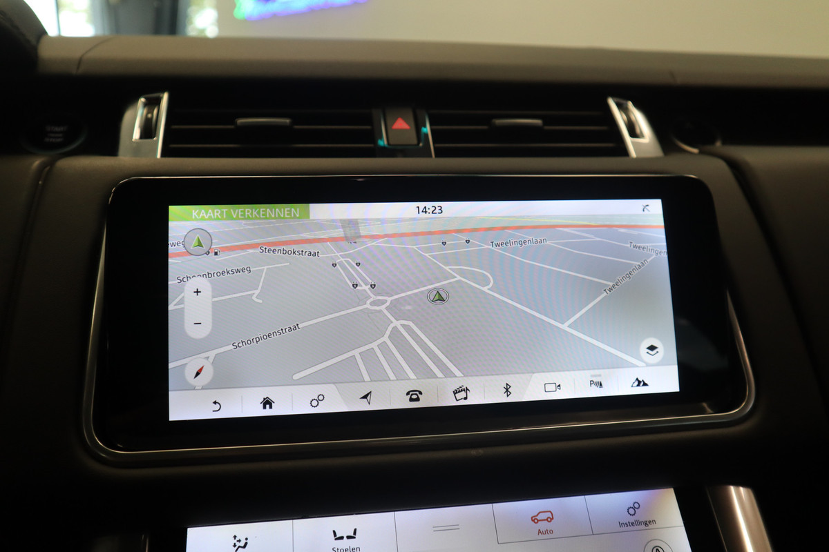 Een cockpit, een informatiecentrum... Wat is de cabine eigenlijk niet? Dankzij het digitale dashboard bent u van alles op de hoogte. Met de hulp van vier camera's, biedt de 360 graden camera op deze auto een panoramisch zicht, wat bijzonder nuttig is bij het parkeren en manoeuvreren. Met adaptive cruise control houdt de auto zelfstandig afstand tot uw voorligger. Een veiligheidsverhogende optie waarmee u comfortabel onderweg bent. Spraaksturing betekent dat u verschillende functies met uw stem kunt bedienen. De ingebouwde Connected Services vertellen u via de app alles over de status van de auto. Locatie, onderhoudsstatus, brandstofpeil en nog veel meer! Ook is de Land Rover uitgerust met: high performance audiosysteem, full map navigatiesysteem, WIFI-hotspot, electronic climate control, schakelpaddles aan het stuur en DAB ontvangst.