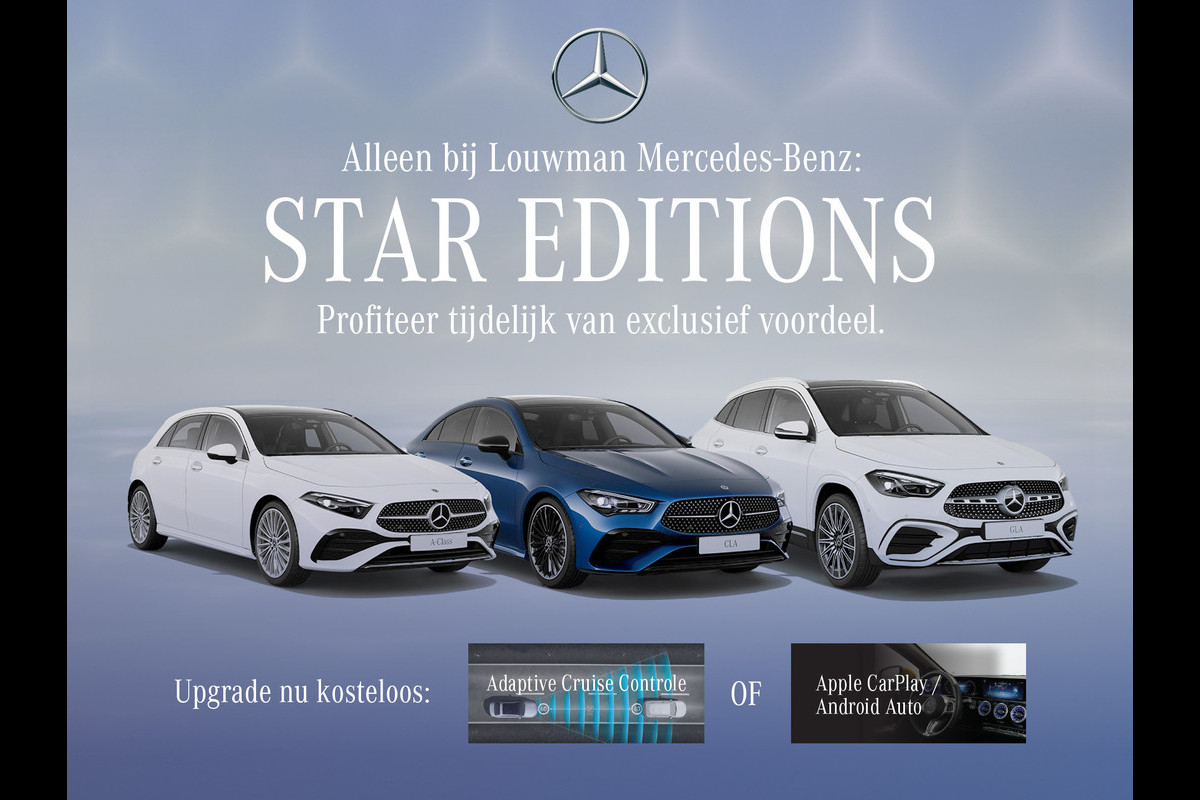 Dit afleverpakket bevat: Mercedes-Benz Certified (24 maanden); BOVAG garantie (24 maanden); BOVAG 40-Puntencheck; Nieuwe APK - Louwman MB Premium (€ 995): • 36 maanden Certified garantie • 24/7Pechhulp Europa dekking • Garantiedekking heel NL • 14 dagen omruilgarantie tot maximaal 2.000 KM • Tenaamstelling/vrijwaring • Complete reiniging in- & exterieur • Certified 100 punten kwaliteitscheck • Gecontroleerde KM-stand • Vloeistoffencheck & bijvullen • Volledig onderhoud conform schema • Nieuwe APK • Gratis vervangend vervoer* *Bij reparaties die langer dan 24 uur duren. Gratis vervangend vervoer kent een maximale duur van 72 uur. **Dit pakket kent een meerprijs voor auto's met 6, 8 of 12 cilinder motoren, vraag naar de voorwaarden.