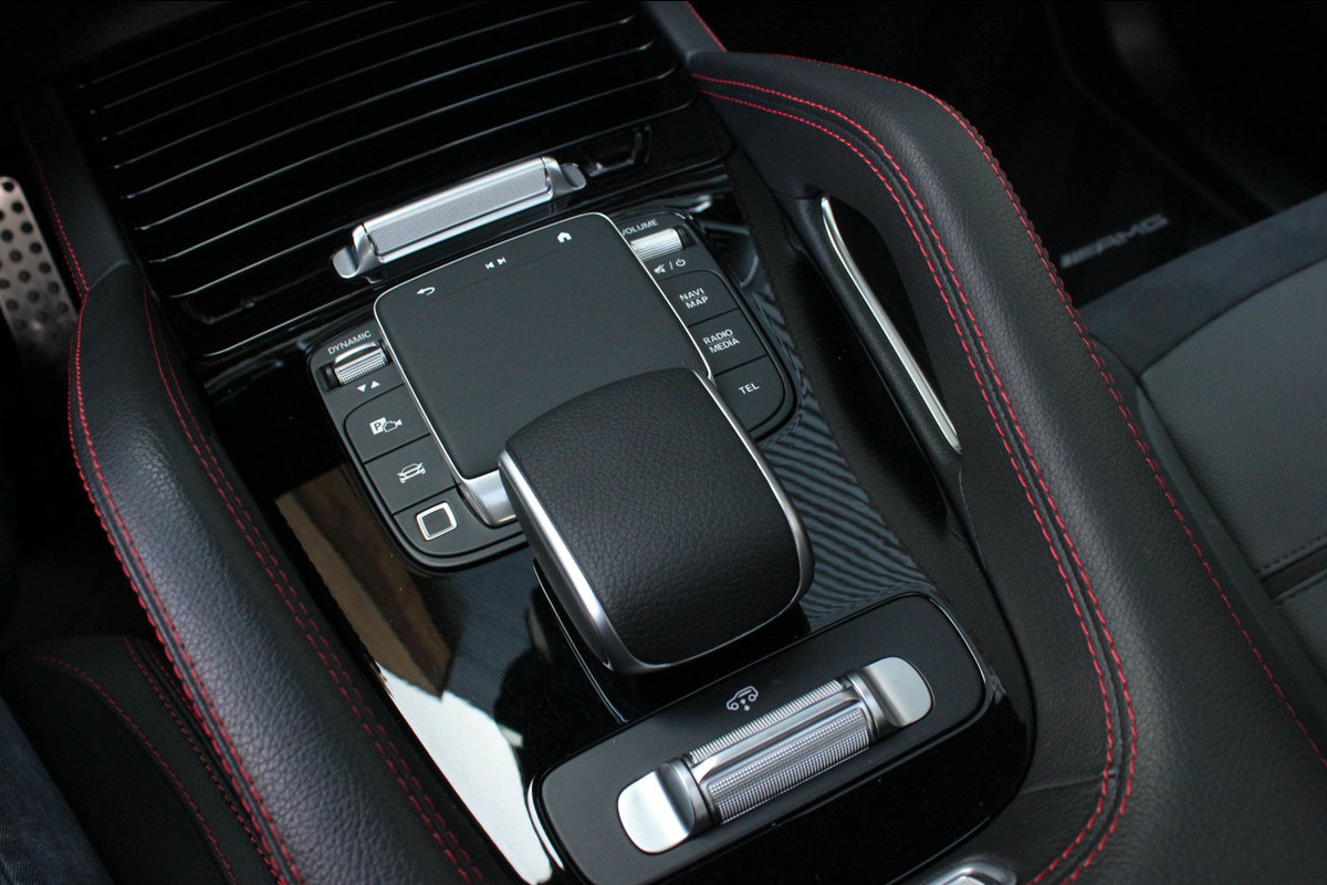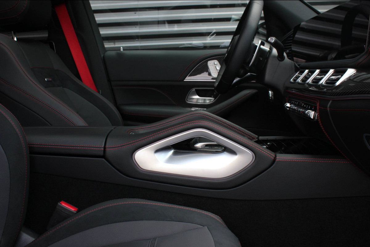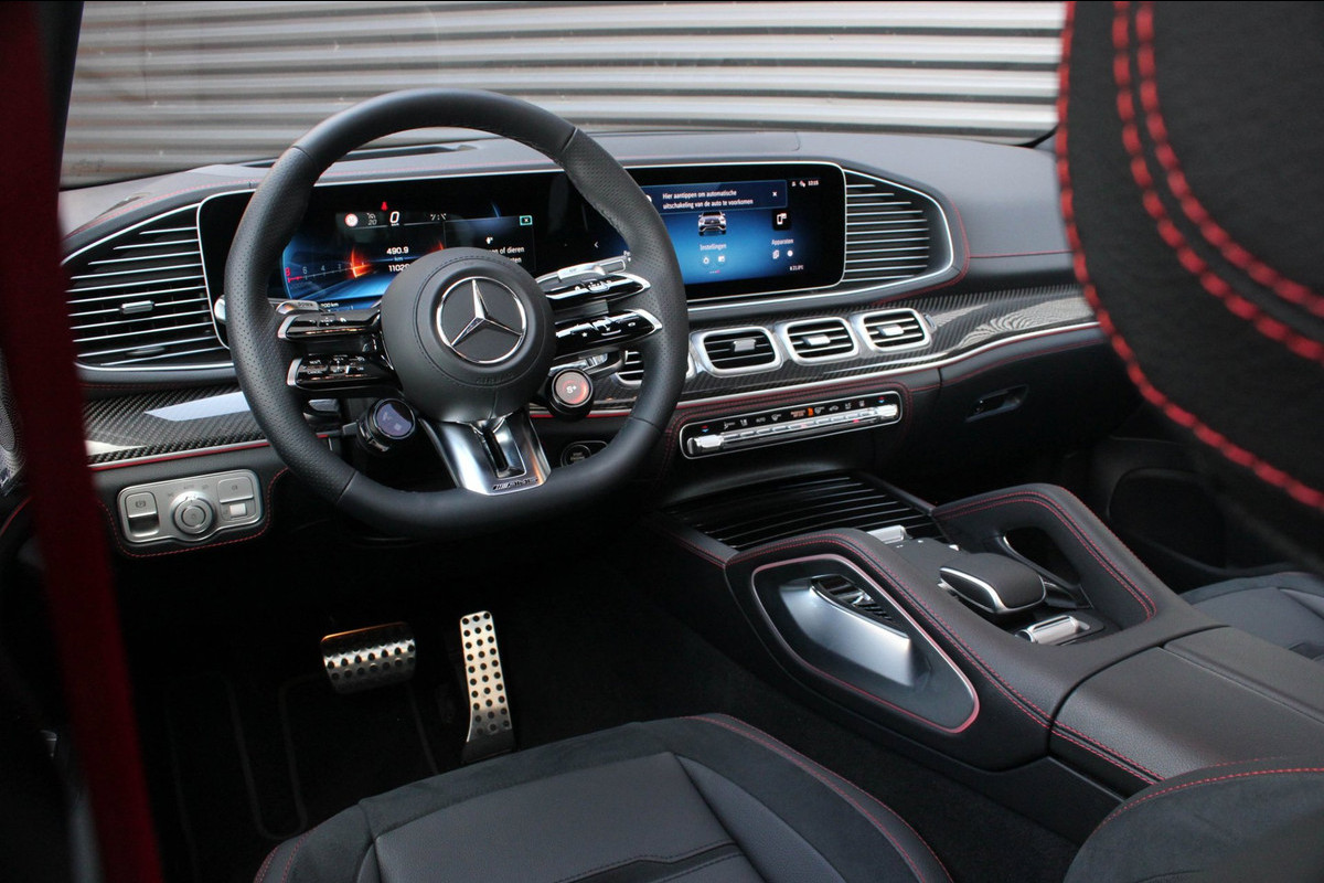 Binnenin wacht een oase van luxe en technologie. Zwart nappaleder met rode veiligheidsgordels, een verwarmd AMG-sportstuur en sfeerverlichting zorgen voor een elegante ambiance. De klimaatcomfortstoelen, zwarte hemelbekleding en Carbon sierdelen onderstrepen de hoogwaardige afwerking. Het Burmester Premium audiosysteem, het head-up display en het MBUX multimediasysteem met Augmented Reality maken elke rit tot een beleving op zich.