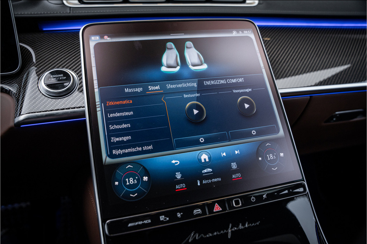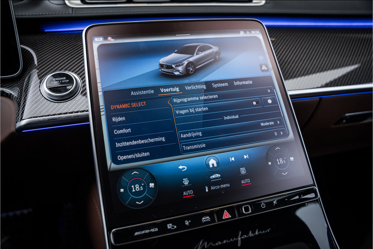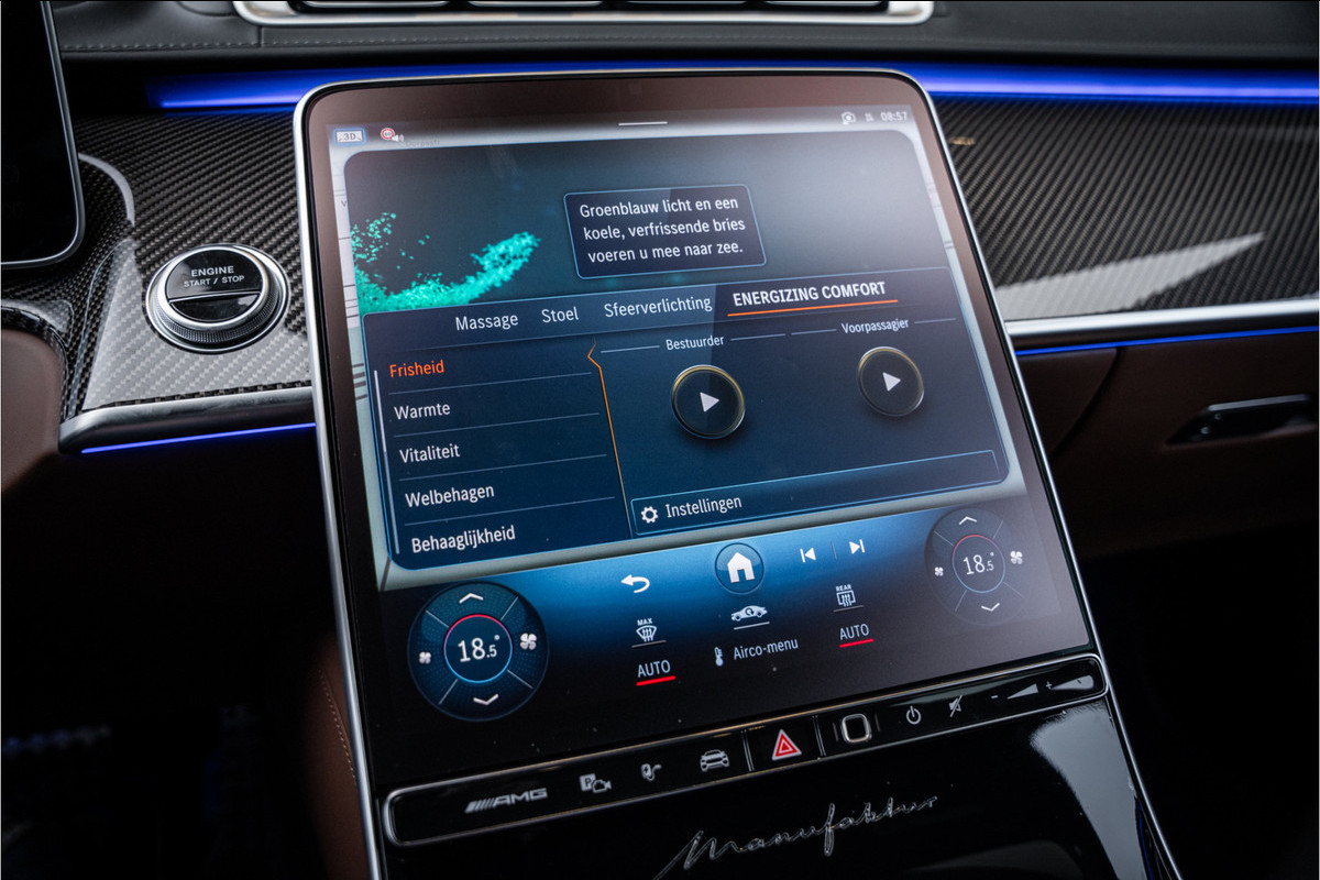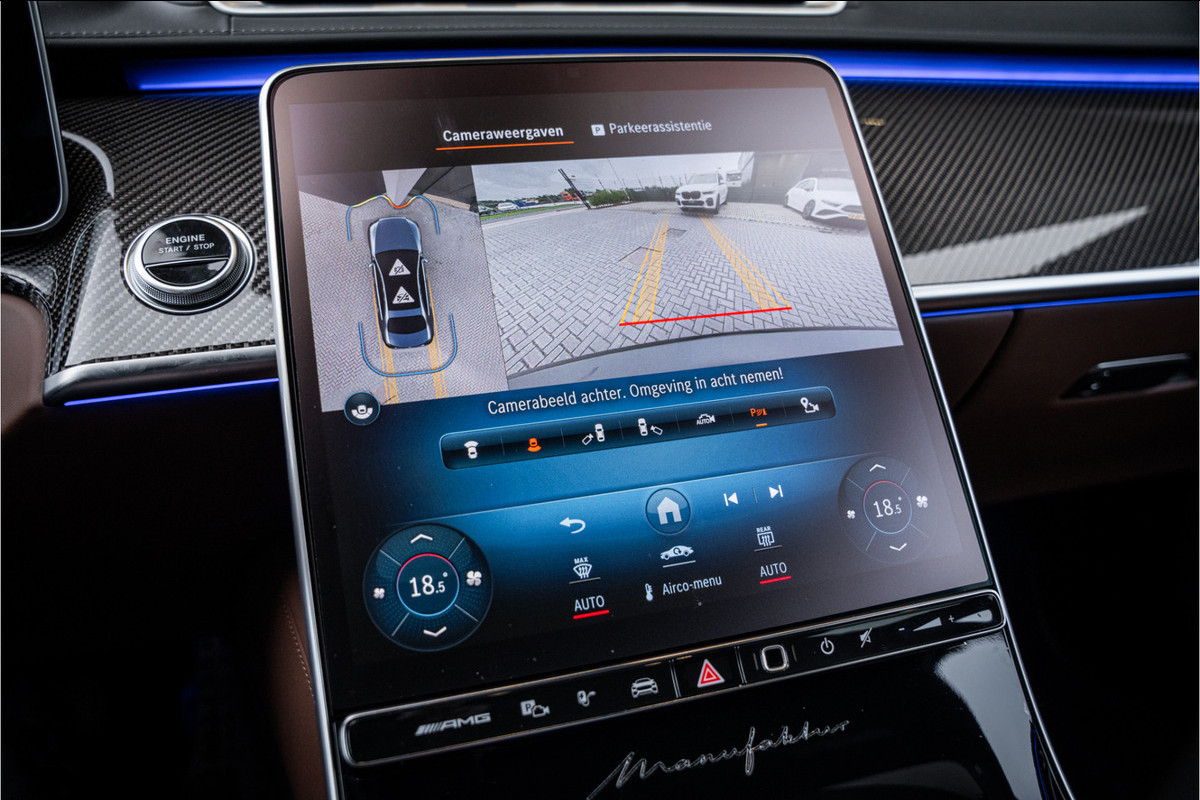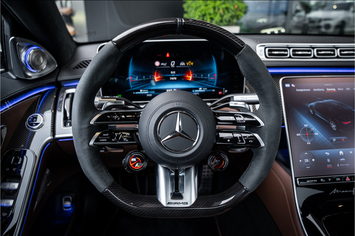 Binnenin ervaar je luxe in overtreffende trap: hoogwaardige materialen, geluidsisolatie, ambient lighting, comfortopties zoals massage, klimaatcontrole op de achterbank, hoogwaardige audio en talloze AMG-en Manufaktur-details die verraden dat dit geen standaard S-klasse is, maar een exclusieve uitvoering voor wie echt het allerbeste wil.