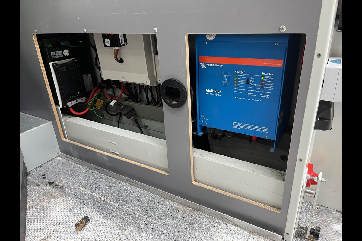 - Stroom op locatie verschillende v230 stopcontacten en 12v aansluitingen doormiddel van een Victron omvormer 3000va 12volt 120amp voor 230v / 220v met buiten wall invoer en Lithium accu. Deze wordt geladen als de bus rijd en kan worden geladen met een stekker.