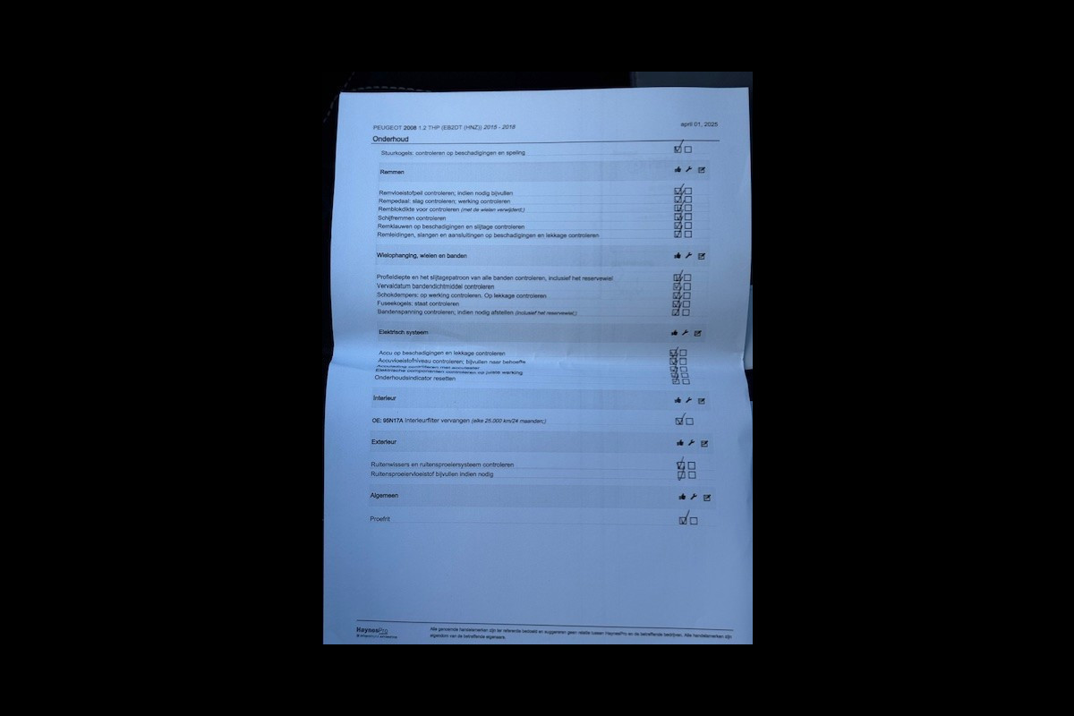 -De auto heeft een pre inspectie en vloeistof controle gehad.