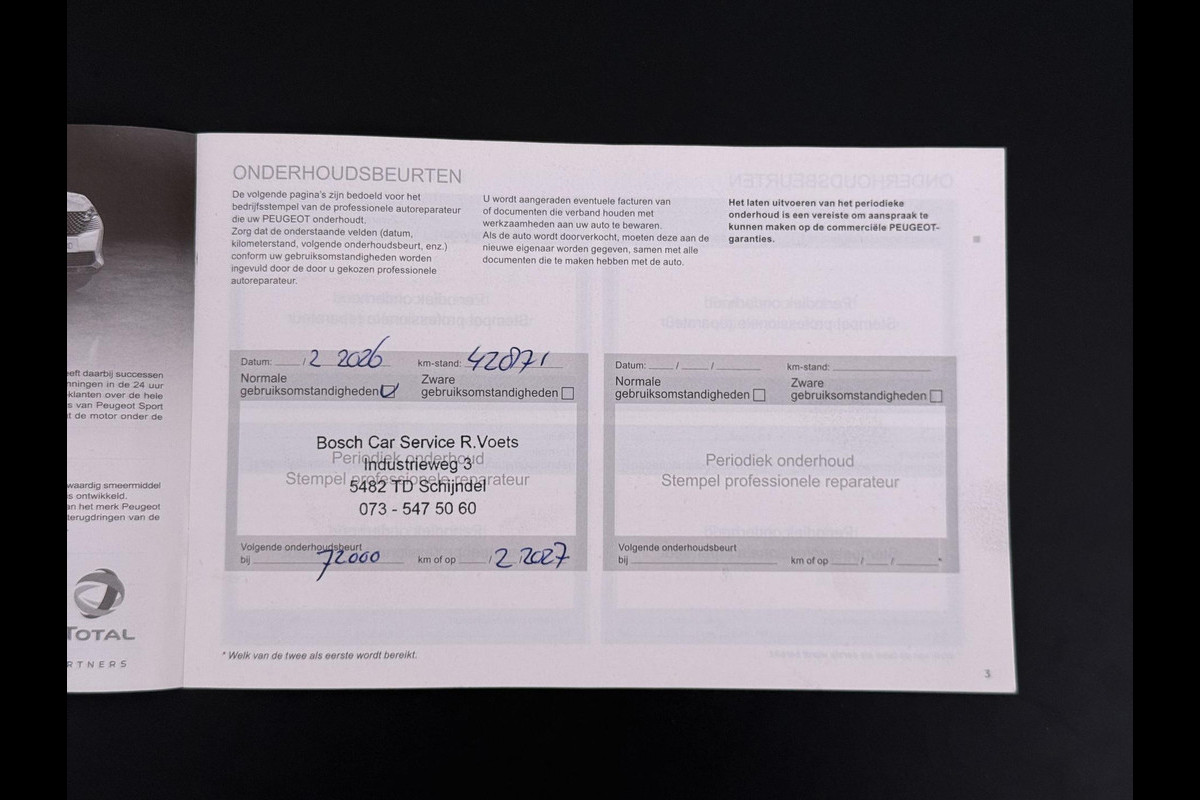 Deze auto heeft intern bij peugeot gereden. Wij hebben deze auto dan ook van Peugeot Frankrijk gekocht. Onderhoud in Frankrijk is intern uitgevoerd. Wij hebben de auto direct bij binnenkomst van nieuw onderhoud voorzien en volledig technisch nagelopen. De auto is daarnaast op schade verleden gecontroleerd met een lakdiktemeter. Deze auto is 100% in orde.
