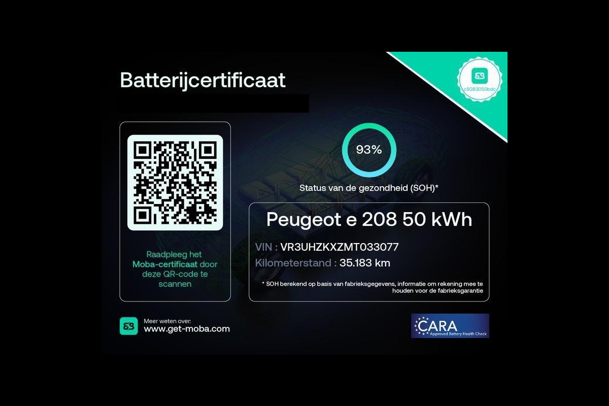 *ER ZIJN SUPERDEALS BIJ DIGO. KIJK EN VERGELIJK, EXTRA SCHERP GEPRIJSD!!! Deze Peugeot e-208 staat in de showroom op de Motorenweg 25 te Delft. Werkelijk zo goed als nieuw! Slechts 35.000 kilometer gereden en VOLLEDIG elektrisch! Mooi, ruim en natuurlijk het beste alternatief voor het milieu. Zero emission. De uitstoot CO2 is dus 0, de accucapaciteit is 50kWh en het actieradius is 340 kilometer ( Fabrieksopgave ). Kan Peugeot E-208 snelladen? Je kan deze Peugeot 208 snelladen met een snelheid van 471 km/u. Thuis laden kan ook met een maximale snelheid van 83 km/u.*****Wij willen u als koper van een elektrische auto geruststellen over de restcapaciteit van het batterijpakket van de gebruikte EV ? Dus zorgen we vooraf dat elke EV een officieel SOH-Certificaat ( state of health) krijgt .Met dit certificaat bent u verzekerd van een juiste informatie over de staat van de accu. Of dat nog 100% is of 60 %, met dit door CARA en TUV afgegeven Europees goedgekeurde certificaat weet u zeker dat u een goede aankoop bij ons doet Het verbruik is afhankelijk van weeromstandigheden, terrein, gebruik van climate control en rijgedrag. Deze e-208 is voorzien van Navigatie, Cruise control, Rijstrooksensor, Climate control, Parkeersensoren, stoere 16'' lichtmetalen velgen en natuurlijk nog veel meer!