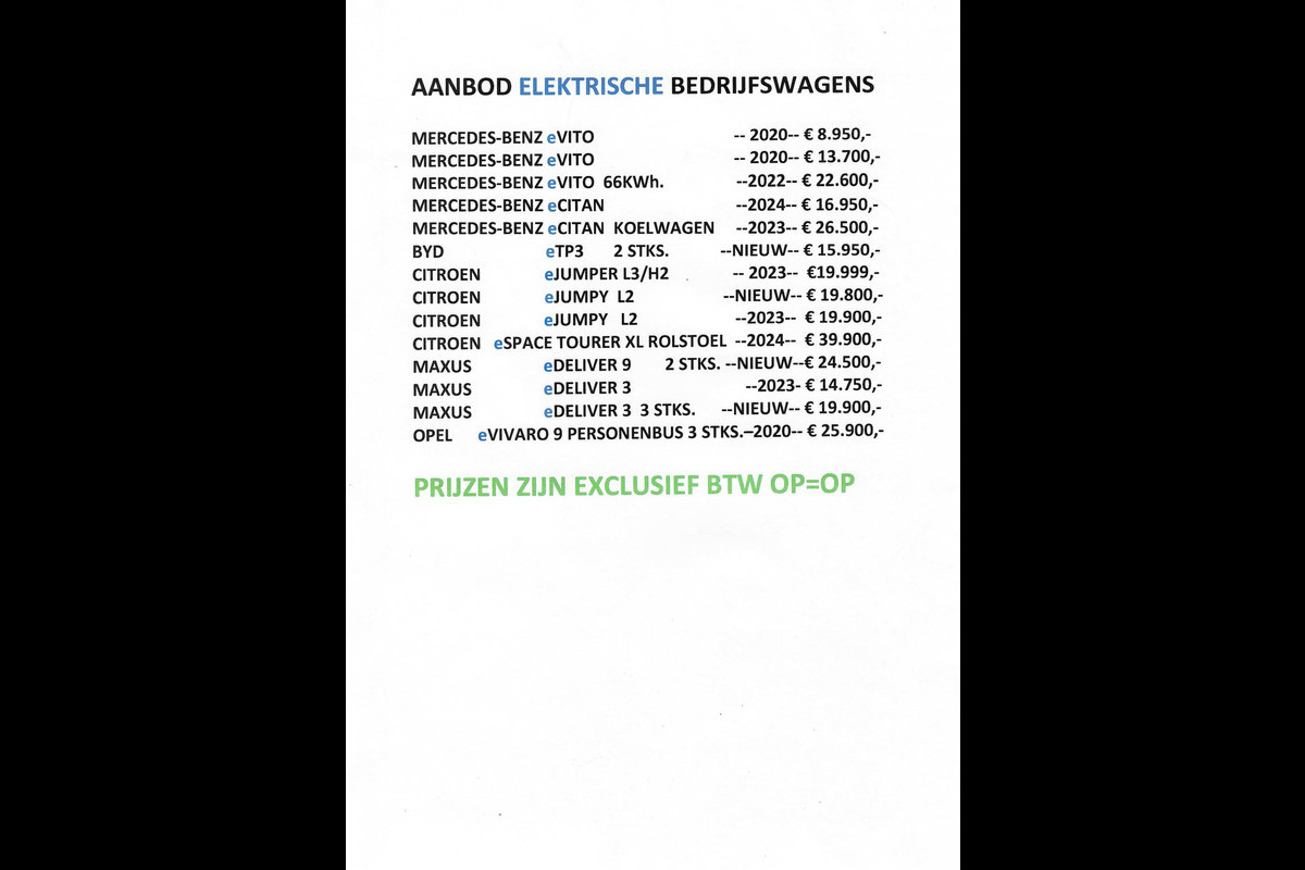 Dit is de scherpe internet meeneemprijs Exclusief BTW Ook bieden wij de mogelijkheid van gespreide betaling in samen werking met de grootste autofinancier van Nederland - ook kunnen wij als service u helpen met uw autoverzekering , Wilt U Zelf bepalen wat u wilt betalen per maand kijk dan op de website van www.autodebruin.nl bij de knop /Financiering . Innovatieve toptechniek en een uitgesproken karakter. De e-Jumpy is een onderscheidende auto met een elektrische aandrijflijn. Stil en stevig optrekken zonder extra uitstoot? De elektromotor zorgt ervoor ! 50 Kwh Batterij ! KOSTEN RIJKLAAR MAKEN INCL AFLEVERINGS BEURT € 699,- Al onze verkopen zijn gebaseerd op business to business (B2B) zonder garantie , Particuliere verkoop is uiteraard mogelijk, vraag naar de mogelijkheden , garantie is mogelijk tegen meerprijs vraag naar de mogelijkheden.