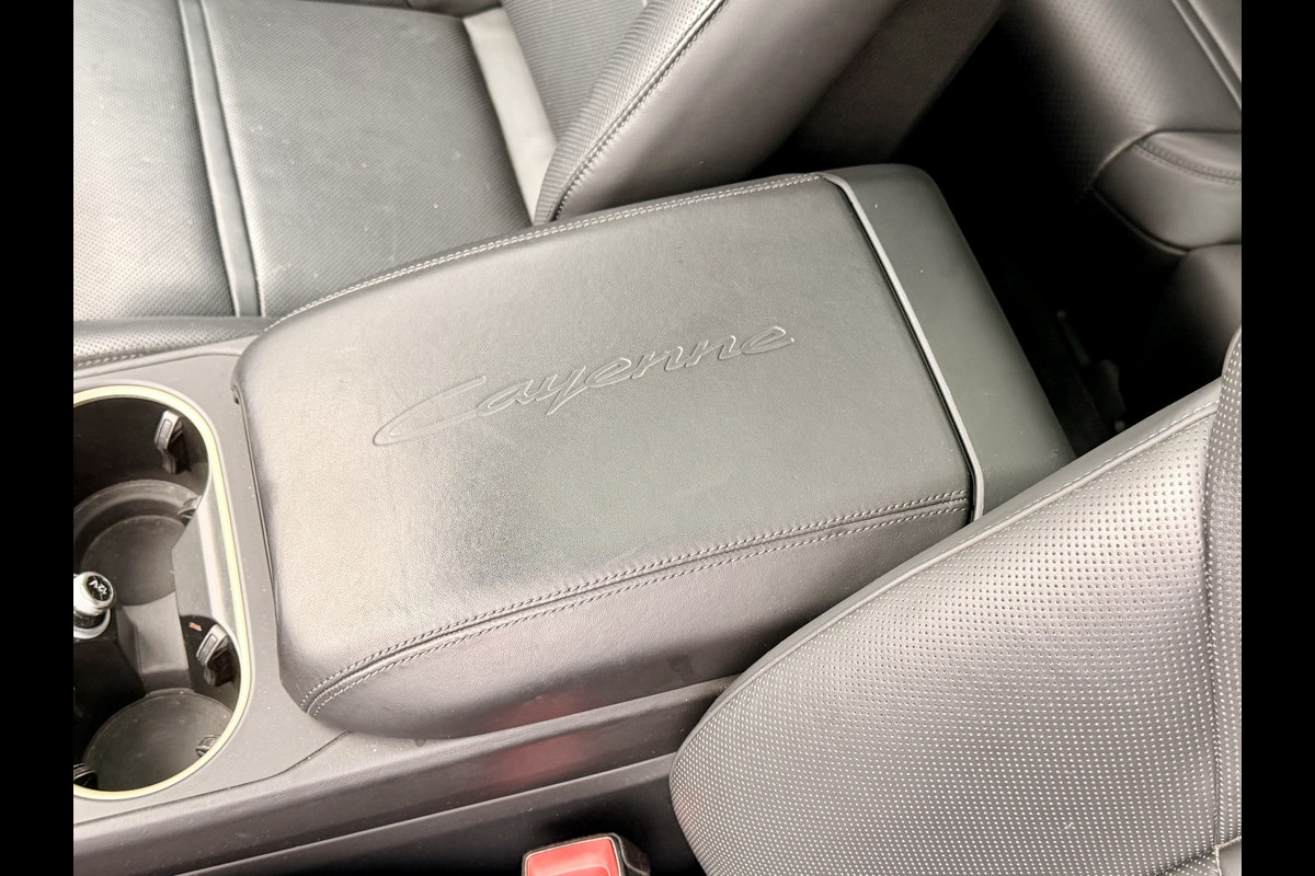 Interieur: Zwarte lederen sportstoelen met Porsche-logo in de hoofdsteunen en ‘Cayenne’-logo op de middenarmsteun