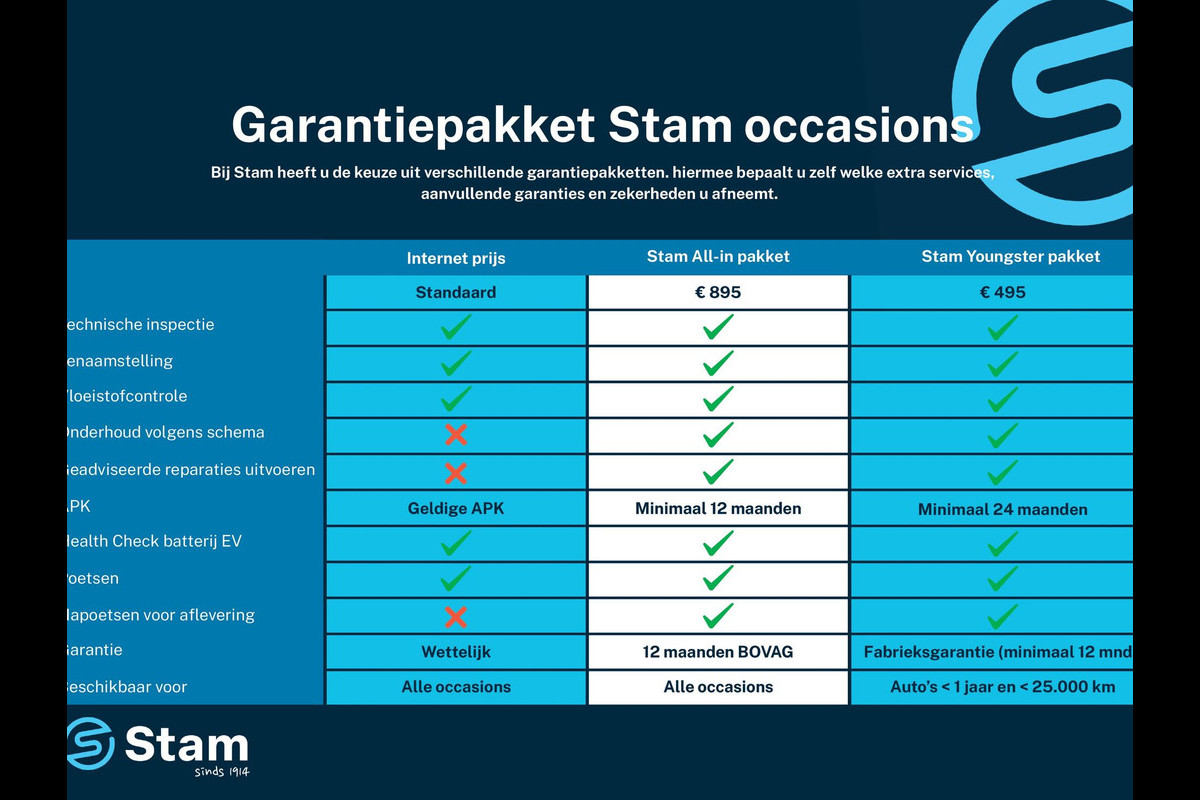 Al onze prijzen zijn inclusief 12 maanden wettelijke garantie en een geldige APK. Voor € 895,- koopt u het Stam All-In pakket met daarin: 12 maanden BOVAG garantie, onderhoud volgens schema, nieuwe APK keuring, technisch klaarmaken en napoetsen. Alle moeite is genomen om de informatie in deze advertentie zo accuraat en actueel mogelijk weer te geven. Fouten zijn echter nooit uit te sluiten. Vertrouw daarom niet alleen op deze informatie, maar controleer bij aankoop de zaken die uw beslissing zouden kunnen beïnvloeden. Stam Autobedrijven sluit iedere aansprakelijkheid voor de in deze advertentie verstrekte informatie uitdrukkelijk uit.