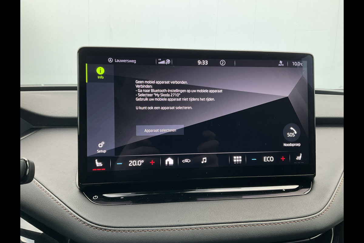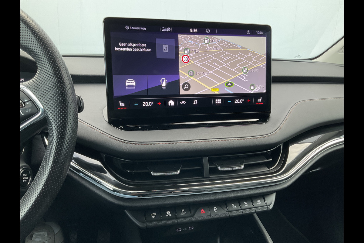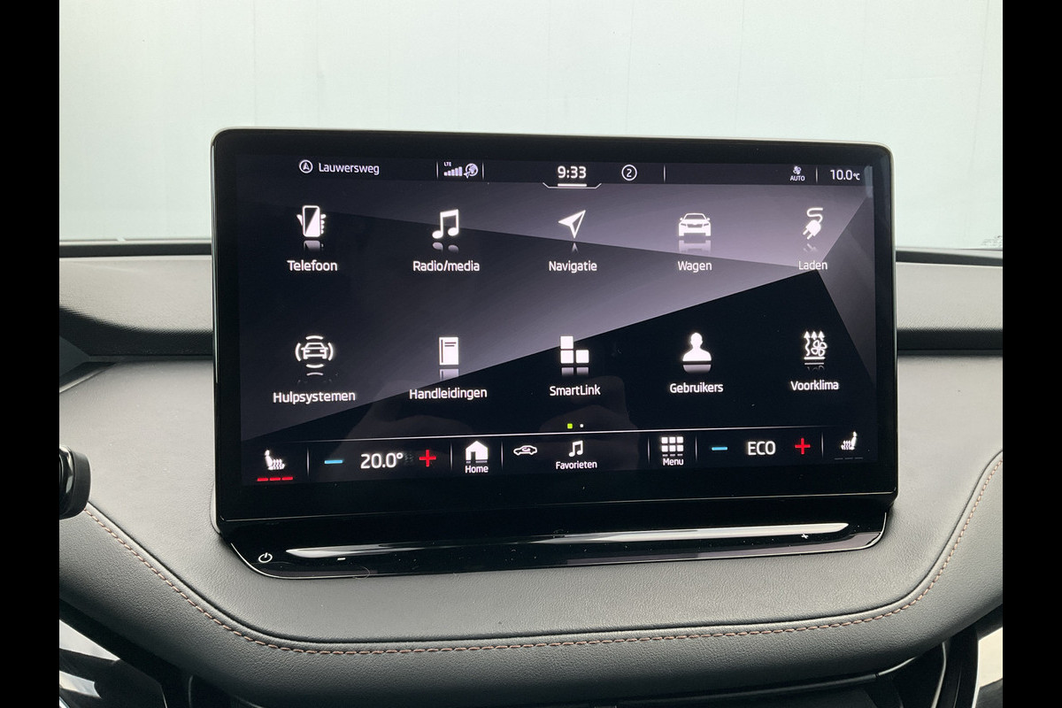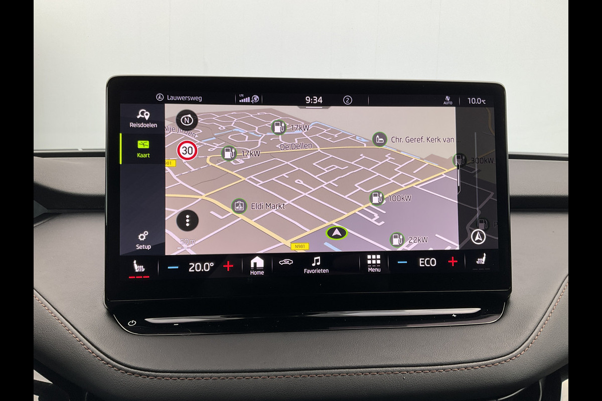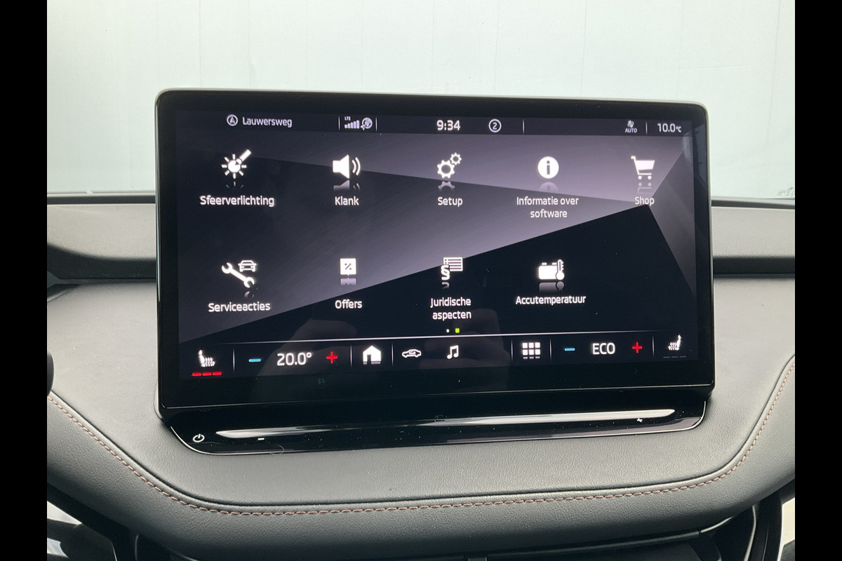Pragmatisch en veilig als deze auto is, beschikt hij over diverse veiligheidssystemen. Bij de veiligheidssystemen van deze ŠKODA hoort ook de verkeersbord-detectie. Die leest tijdens het rijden als het ware met u mee en attendeert u op de significante verkeersborden langs en boven de weg. Deze ŠKODA Enyaq iV is ook behulpzaam als het gaat om een rechte koers. Het Lane-keeping systeem signaleert en corrigeert als u onbedoeld de rijstrooklijnen dreigt te overschrijden. Mindert een voorligger onverwachts te veel vaart, dan komt de forward collision warning in actie en waarschuwt meteen. Verder is deze auto uitgerust met dodehoekdetectie, vermoeidheidsherkenning, autonoom remsysteem en bandenspanningcontrolesysteem.