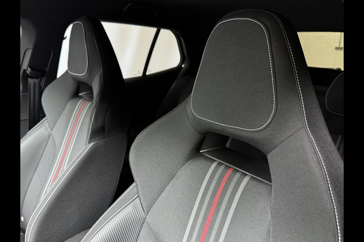 Sportstoelen met geïntegreerde hoofdsteunen in zwart/grijs met rode accenten maken indruk.