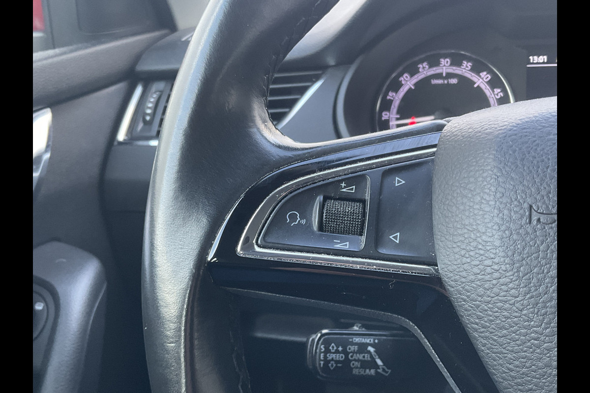 Adaptive cruise control is een comfortabele en veilige optie. Het systeem reguleert de snelheid en houdt automatisch afstand tot uw voorligger. Onderweg kunt u veilig genieten van het audiosysteem en het full map navigatiesysteem. Want in deze ŠKODA bedient u ze vanaf het stuurwiel of met uw stem. Geef uw smartphone onderweg weer energie; zonder snoer, met de draadloze oplaadmogelijkheid voor telefoons. Uiteraard voorzien van Qi-technologie. Of het buiten nu warm is of koud, dankzij automatische airconditioning is het binnen altijd behaaglijk. Inparkeren zonder angst voor schade. De parkeersensoren helpen u om moeiteloos in de kleinste parkeervakken te manoeuvreren. Deze auto is voorzien van regensensor, automatisch dimmende buitenspiegels, lederen stuur, centrale deurvergrendeling met afstandsbediening, boordcomputer en lederen versnellingspook.