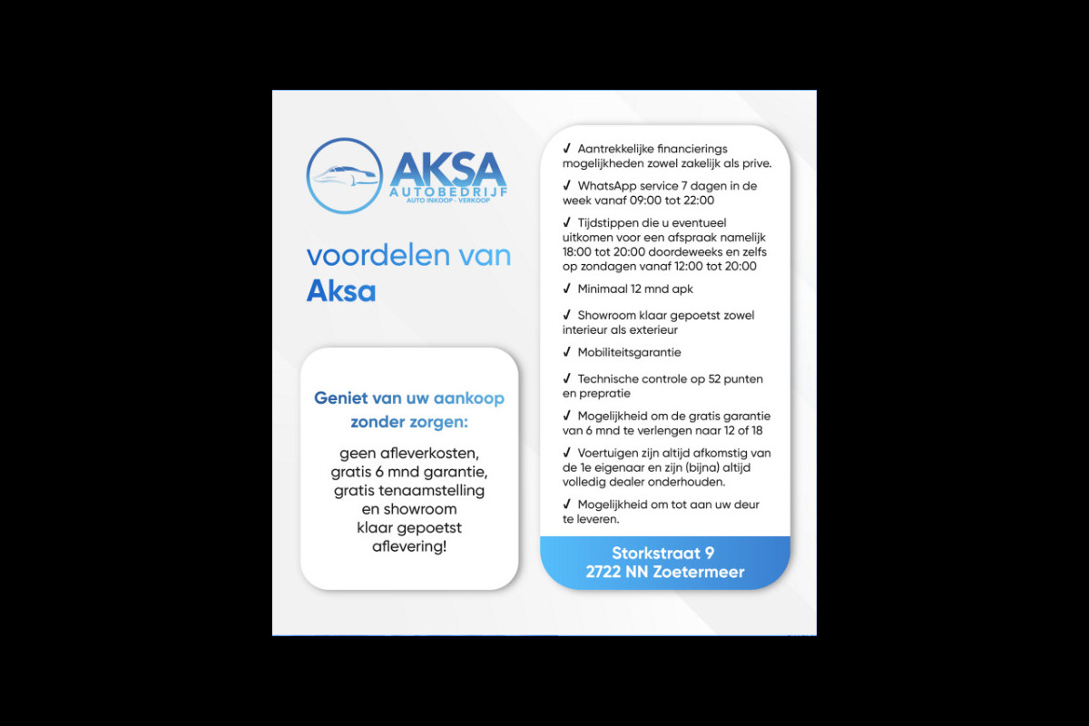 Alle Autobedrijf Aksa occasions worden met alle mogelijke nauwkeurigheid gefotografeerd en omschreven. Dit is om onze jonge occasions voor u zo duidelijk mogelijk te presenteren. Desondanks kan het voorkomen dat we een optie vergeten of verkeerd aanvinken. Controleer dan ook zelf altijd wat u belangrijk vindt. Mochten wij per ongelijk een fout maken in het omschrijven van één van onze occasions dan kunnen daar geen rechten worden ontleend.